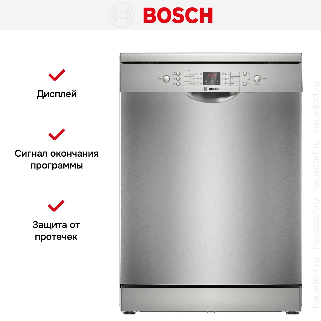 Отдельностоящая модель Бош отлично впишется в кухонный интерьер, главное — правильно выбрать место, чтобы подвести коммуникации. Имеет стандартные размеры, поэтому может не поместиться на очень маленькой кухне. В камеру можно загрузить ограниченное число комплектов: 13 шт. Комплектом считается набор посуды на одного человека, который нужен для полноценного приема пищи: глубокая и плоская тарелки, тарелка для салата, блюдце под чашку, сама чашка, ложка и вилка.