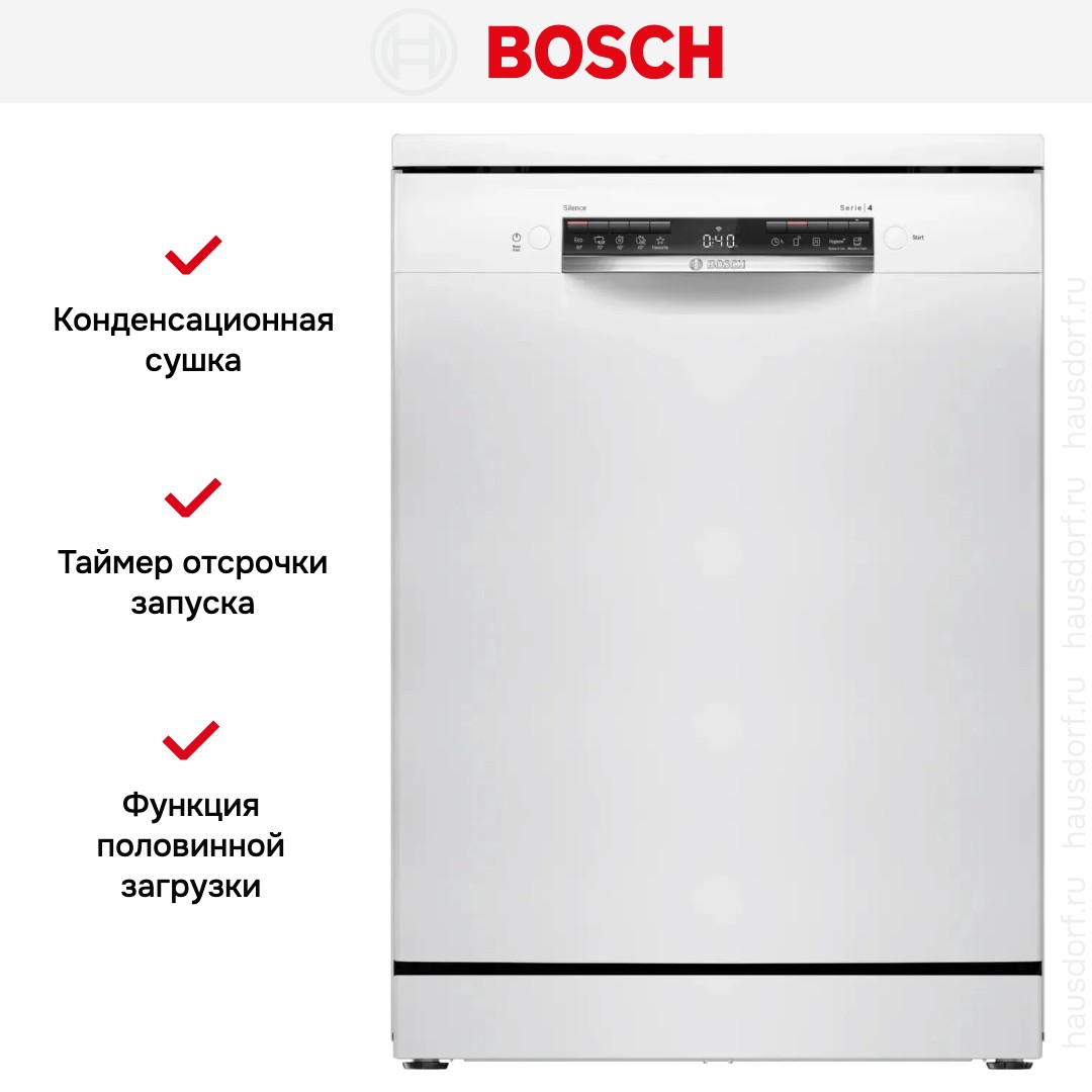 Посудомоечная машина Bosch SMS4IKW51Q — это полноразмерная, вместительная и технологичная техника, созданная для больших семей и активного использования на кухне. Благодаря габаритам 84,5×60×60 см и отдельно стоящему исполнению модель легко интегрируется в классическую кухонную зону и не требует встраивания. Благодаря вместимости до 13 комплектов посуды она справляется даже с большой загрузкой после семейных обедов или приёмов гостей. Агрегат выполнен в лаконичном белом корпусе с контрастной чёрной панелью управления, что придаёт ему современный и элегантный вид. Устройство оснащено пятью стандартными программами и четырьмя температурными режимами, что позволяет подобрать оптимальный цикл для любого типа загрязнений — от деликатной мойки стекла до интенсивной очистки жирной посуды. Конденсационная система сушки обеспечивает эффективное и бережное удаление влаги без резких перепадов температуры, защищая хрупкие предметы от повреждений. Электронное управление осуществляется через открытую панель с цифровым дисплеем, на котором отображается текущий этап процесса, оставшееся время и выбранный режим. Функция отложенного старта на срок от 1 до 24 часов позволяет гибко планировать работу — например, запускать цикл ночью или в период действия сниженных тарифов на электроэнергию. Продуманная организация внутреннего пространства, регулируемые корзины и система защиты от протечек обеспечивают комфорт и безопасность при эксплуатации. Низкий уровень шума, энергоэффективность и разумный расход воды подчеркивают заботу об окружающей среде и экономию ресурсов. Эта модель сочетает в себе надежность, функциональность и современный дизайн и станет незаменимым помощником на кухне.
