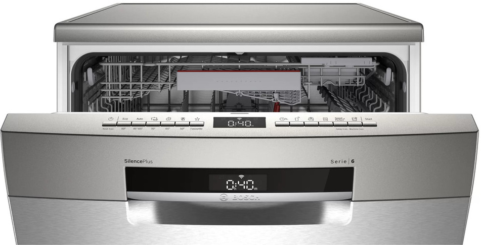 Отдельностоящая модель Бош отлично впишется в кухонный интерьер, главное — правильно выбрать место, чтобы подвести коммуникации. Имеет стандартные размеры, поэтому может не поместиться на очень маленькой кухне. В камеру можно загрузить ограниченное число комплектов: 13 шт. Комплектом считается набор посуды на одного человека, который нужен для полноценного приема пищи: глубокая и плоская тарелки, тарелка для салата, блюдце под чашку, сама чашка, ложка и вилка.