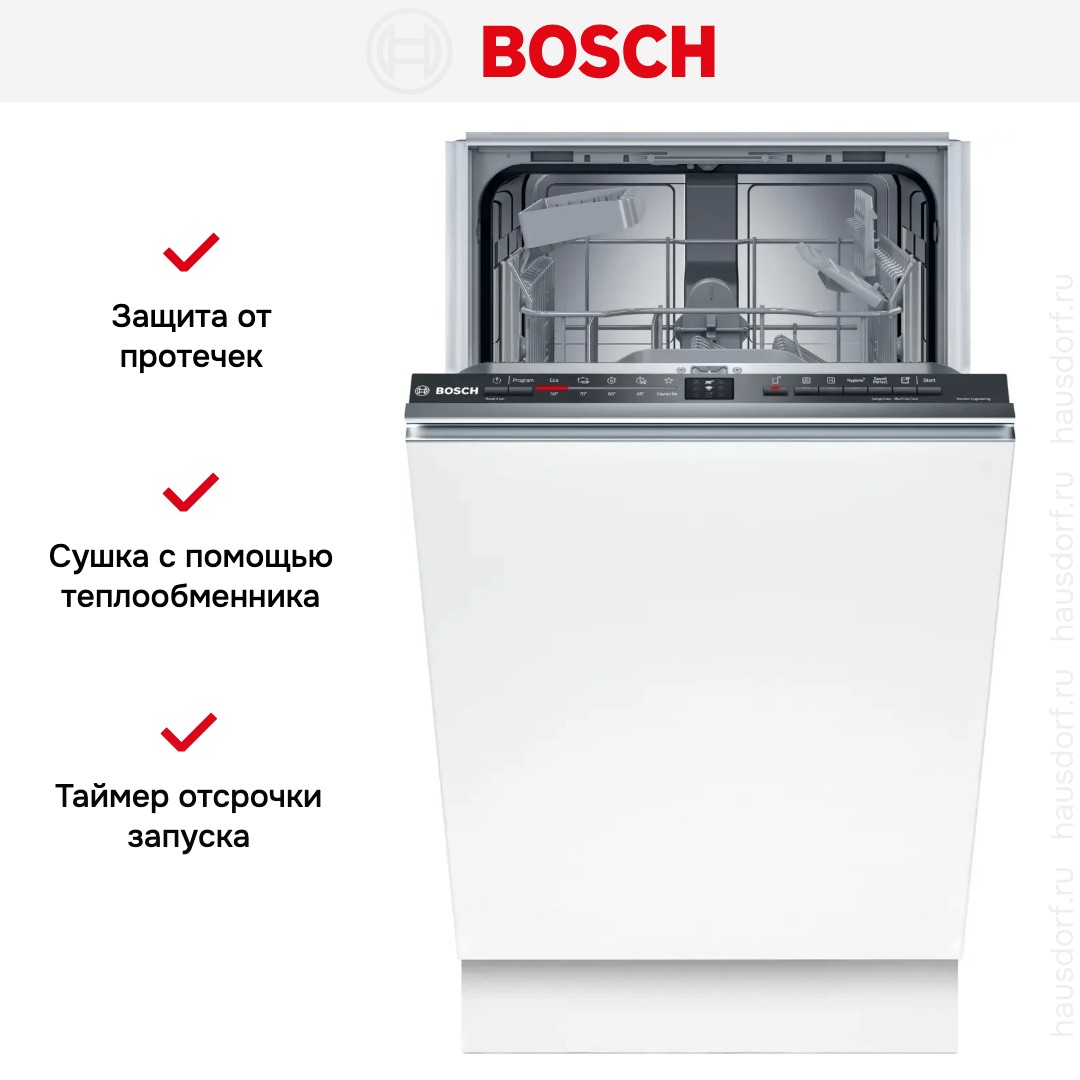 Встраиваемая модель Бош отлично впишется в любой интерьер, главное — правильно выбрать место, чтобы подвести коммуникации. Устанавливается в нишу целиком, полностью закрывается декоративной панелью. Обратите внимание: в комплекте не идет фасад, его необходимо установить самостоятельно. Имеет уменьшенную ширину — благодаря этому поместится даже на очень маленькой кухне. В камеру можно загрузить ограниченное число комплектов: 9 шт. Комплектом считается набор посуды на одного человека, который нужен для полноценного приема пищи: глубокая и плоская тарелки, тарелка для салата, блюдце под чашку, сама чашка, ложка и вилка.