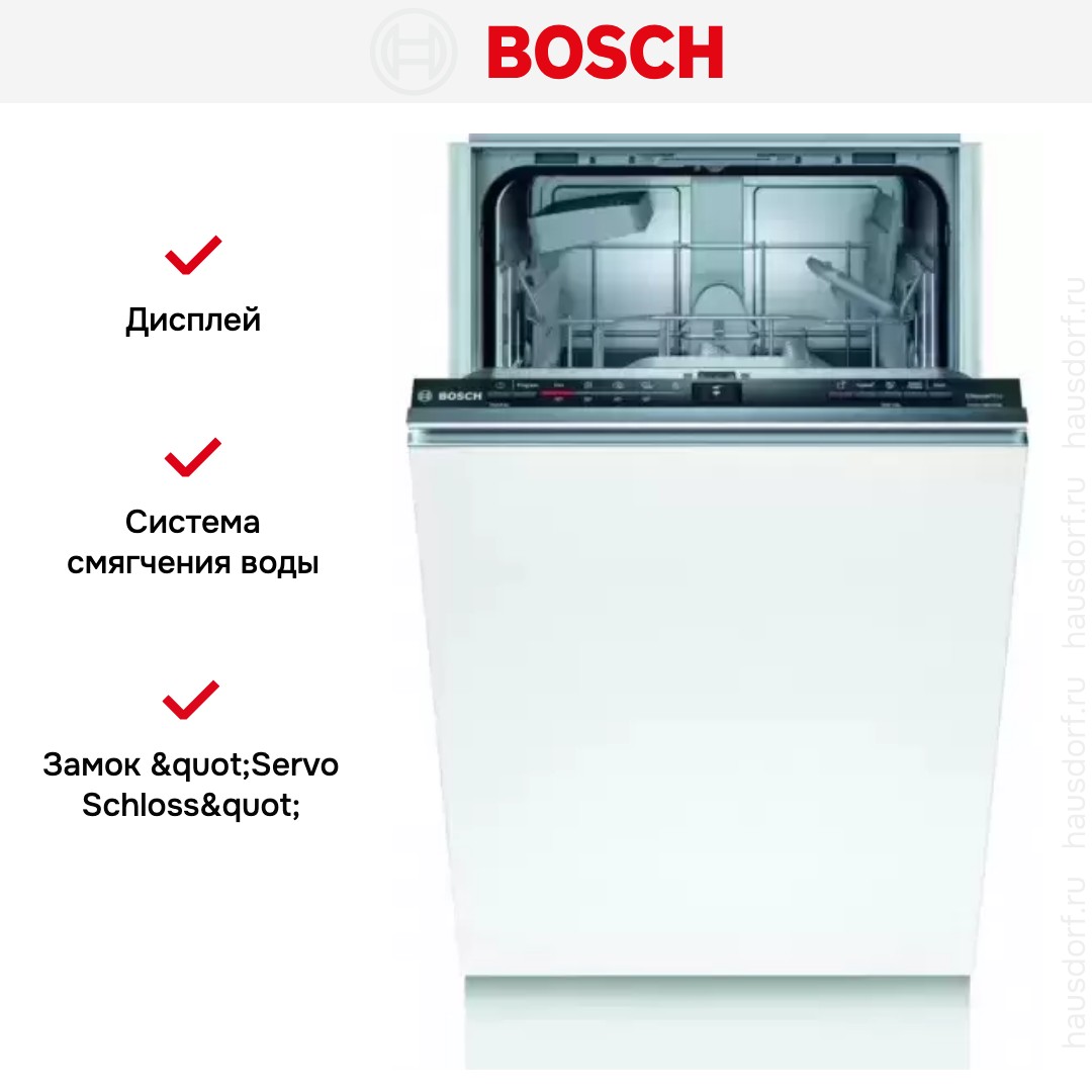Встраиваемая модель Бош отлично впишется в любой интерьер, главное — правильно выбрать место, чтобы подвести коммуникации. Устанавливается в нишу целиком, полностью закрывается декоративной панелью. Обратите внимание: в комплекте не идет фасад, его необходимо установить самостоятельно. Имеет уменьшенную ширину — благодаря этому поместится даже на очень маленькой кухне. В камеру можно загрузить ограниченное число комплектов: 9 шт. Комплектом считается набор посуды на одного человека, который нужен для полноценного приема пищи: глубокая и плоская тарелки, тарелка для салата, блюдце под чашку, сама чашка, ложка и вилка.