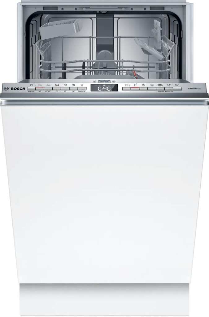Встраиваемая модель Бош отлично впишется в любой интерьер, главное — правильно выбрать место, чтобы подвести коммуникации. Устанавливается в нишу целиком, полностью закрывается декоративной панелью. Обратите внимание: в комплекте не идет фасад, его необходимо установить самостоятельно. Имеет уменьшенную ширину — благодаря этому поместится даже на очень маленькой кухне. В камеру можно загрузить ограниченное число комплектов: 10 шт. Комплектом считается набор посуды на одного человека, который нужен для полноценного приема пищи: глубокая и плоская тарелки, тарелка для салата, блюдце под чашку, сама чашка, ложка и вилка.