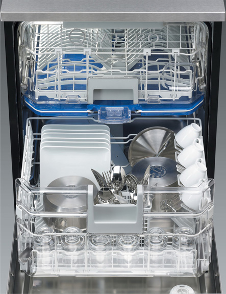 Для высококачественного мытья требуются три компонента. Порошок служит для удаления загрязнений, оставшихся на посуде. Соль нейтрализует примеси, содержащиеся в водопроводной воде, и позволяет избавиться от накипи и известковых отложений на посуде и внутренней поверхности камеры. И, наконец, ополаскиватель позволяет уменьшить поверхностное натяжение воды при помощи специальных составляющих — тензидов, которые облегчают скатывание капель воды. Он способствует удалению остатков порошка и соли, придает посуде ослепительный блеск, и в конечном счете обеспечивает лучшее и быстрое высыхание, а также отсутствие разводов и потеков на ее поверхности.
