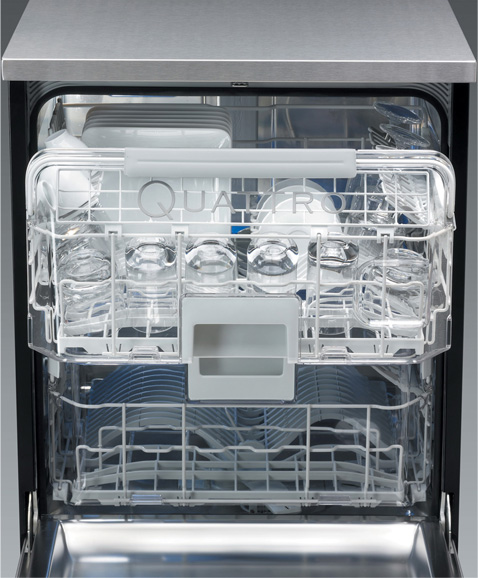 Посудомоечная машина De Dietrich DQF 754 XE 1 оснащена технологией Quattro Concept – два короба (верхний и нижний) могут быть использованы по отдельности. Можно разделить посуду по типу или степени загрязнения, разложить ее по соответствующим зонам и использовать разные программы мытья одновременно.