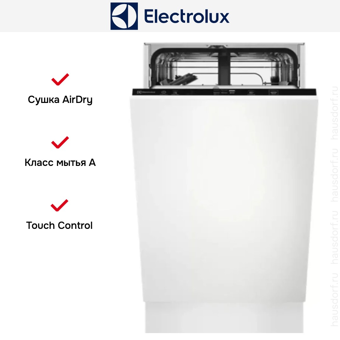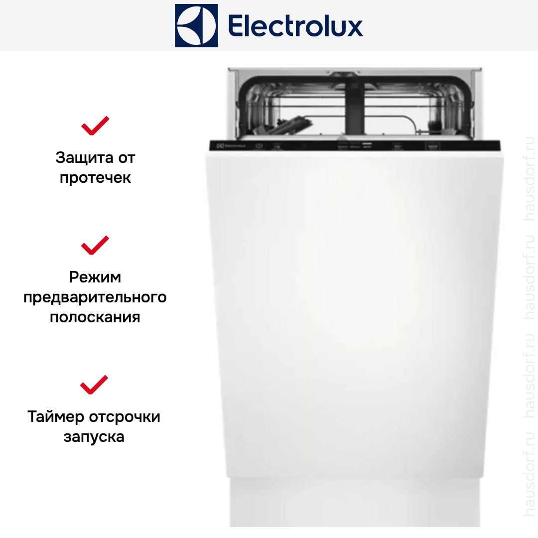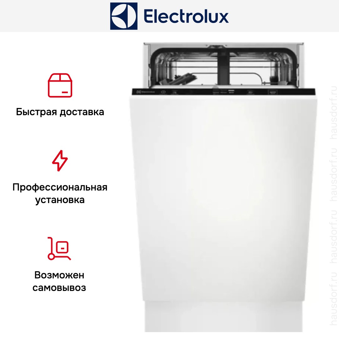 Встраиваемая модель Электролюкс отлично впишется в любой интерьер, главное — правильно выбрать место, чтобы подвести коммуникации. Устанавливается в нишу целиком, полностью закрывается декоративной панелью. Обратите внимание: в комплекте не идет фасад, его необходимо установить самостоятельно. Имеет уменьшенную ширину — благодаря этому поместится даже на очень маленькой кухне. В камеру можно загрузить ограниченное число комплектов. Комплектом считается набор посуды на одного человека, который нужен для полноценного приема пищи: глубокая и плоская тарелки, тарелка для салата, блюдце под чашку, сама чашка, ложка и вилка.