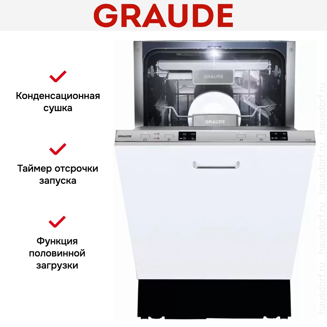 Встраиваемая посудомоечная машина Graude VG 45.0 не смотря на узкий корпус может вмещать в себя до 10 комплектов столовых приборов.