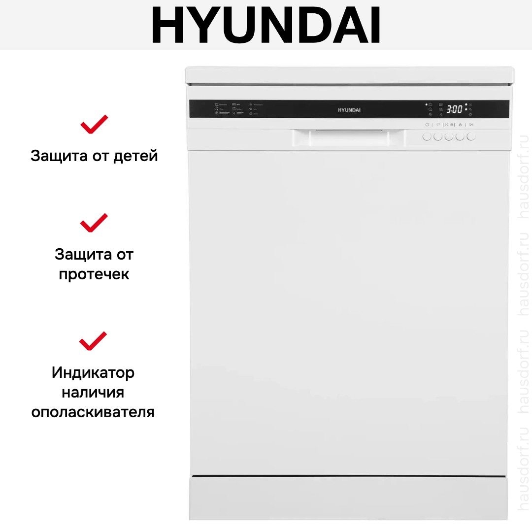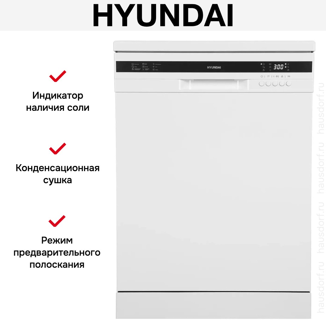 Посудомоечная машина Hyundai DF126 — отдельно стоящий полноразмерный прибор в элегантном белом цвете, отлично впишется в любой кухонный интерьер. Габариты 84.5×60×60 см делают устройство совместимым с большинством стандартных ниш и обеспечивают удобство установки. Панель управления доступна в белом или чёрном исполнении и имеет открытую электронную панель с цифровым дисплеем.