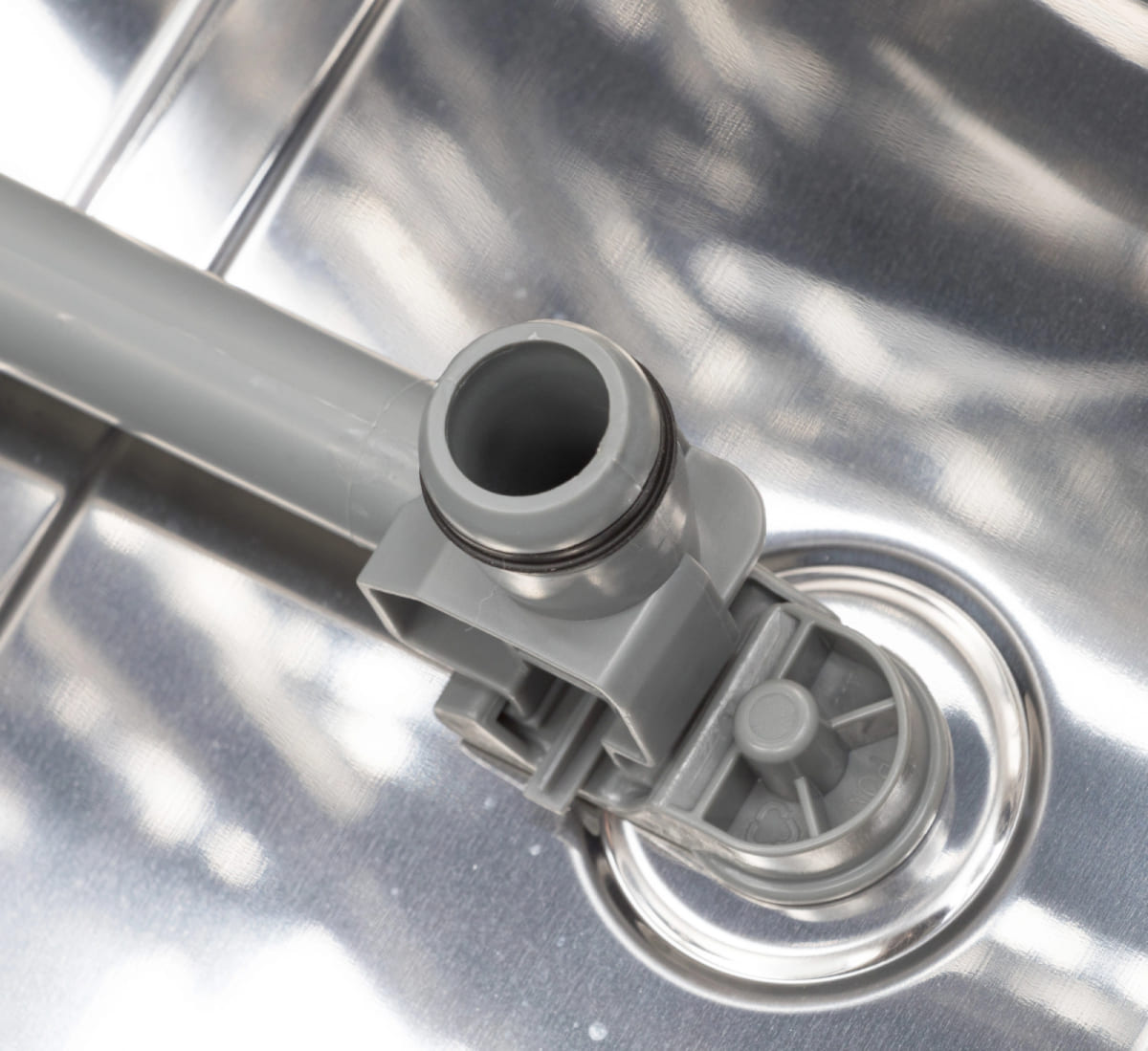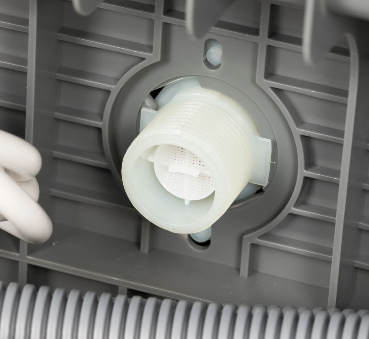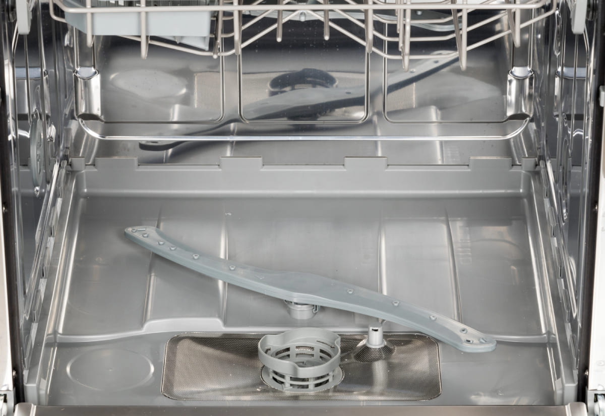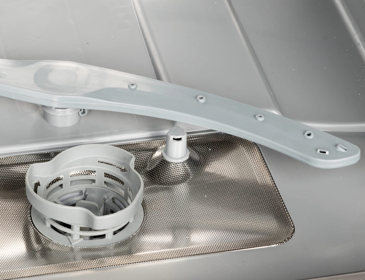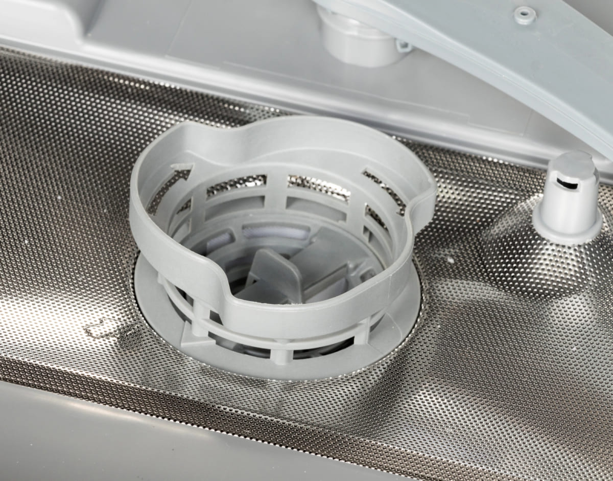 Сливной фильтр располагается на дне камеры и предотвращает попадание в канализацию остатков пищи и засорение сливного шланга и насоса. Материал изготовления и конструкция фильтра зависит от модели посудомойки. В устройствах премиум-класса сливной фильтр изготавливается из стали и имеет вид цилиндра из частой сетки, задерживающей даже мелкий мусор. В более дешевых моделях эта деталь может изготавливаться из пластика. Рекомендуется извлекать и промывать этот фильтр не реже раза в месяц при постоянном использовании посудомойки, а посуду перед помещением в корзину очищать от крупных остатков пищи.