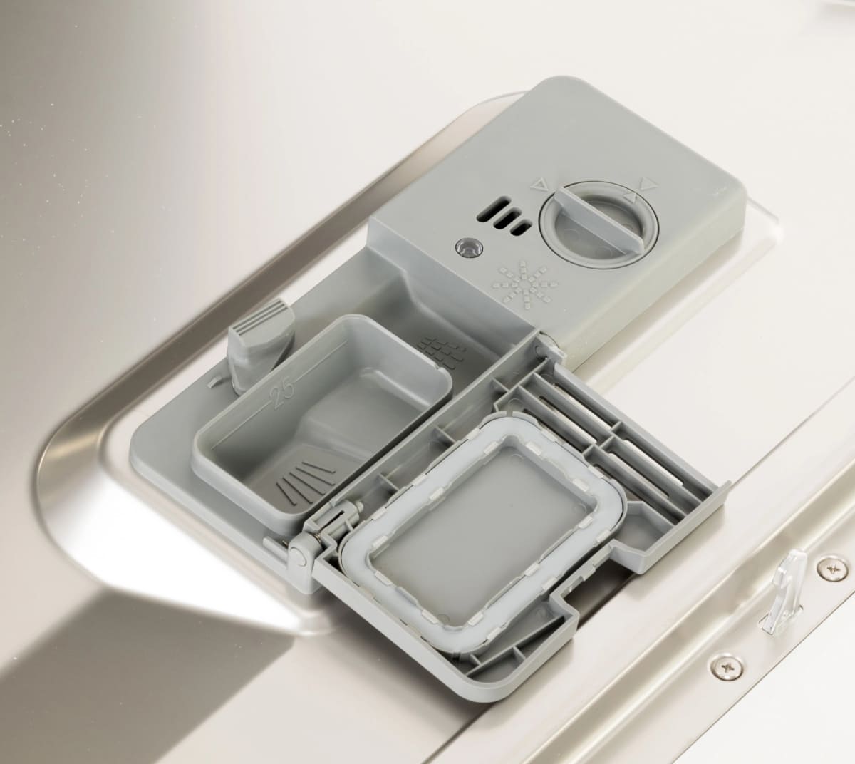 Чтобы смягчить водопроводную воду, в посудомоечных машинах устанавливается резервуар, куда загружается специальная соль. Перед первым использованием посудомойки необходимо выяснить уровень жесткости воды и отрегулировать систему смягчения. По умолчанию в машинах устанавливается средний уровень жесткости. Узнать уровень жесткости в той или иной местности можно при помощи специальных приборов или тест-полосок. Также эти сведения можно получить в соответствующей организации.