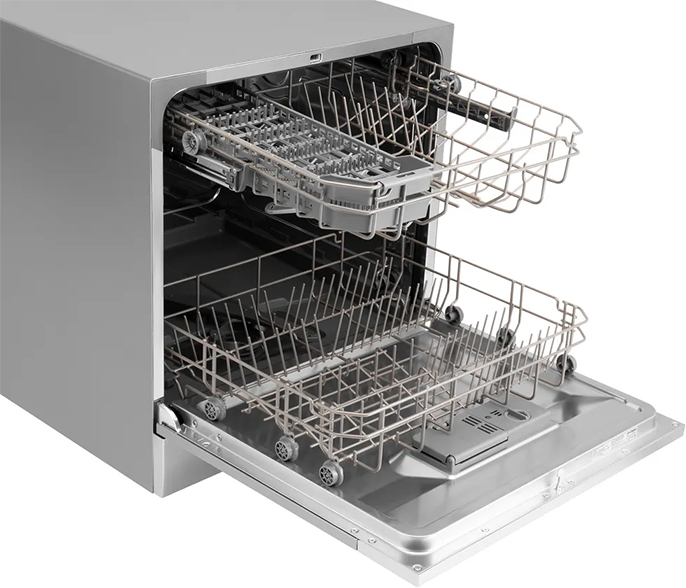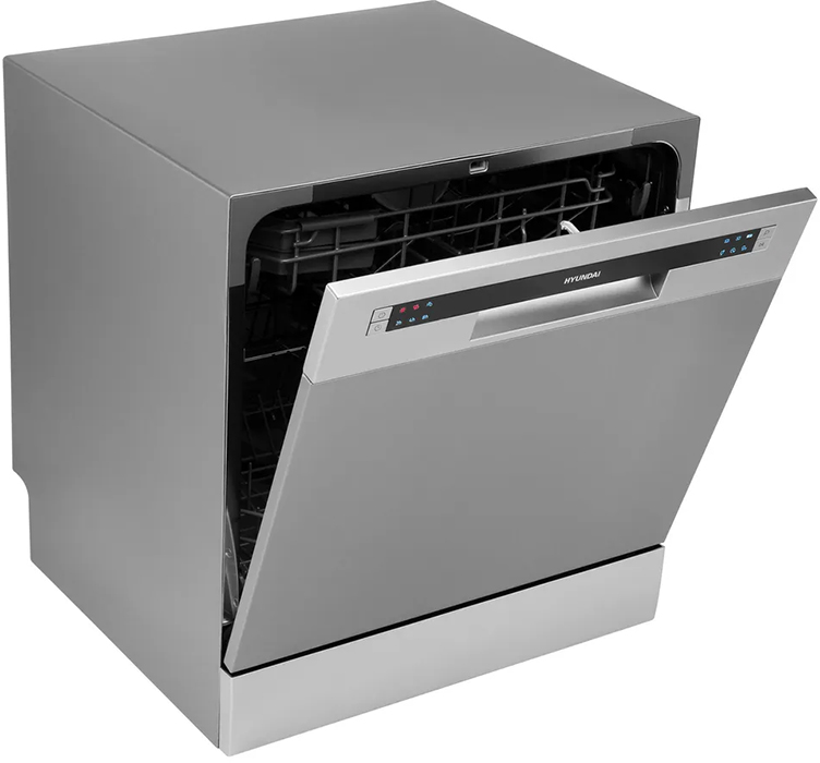 Отдельностоящая модель Хендай отлично впишется в кухонный интерьер, главное — правильно выбрать место, чтобы подвести коммуникации. Компактные размеры позволяют разместить ее даже на очень маленькой кухне. В камеру можно загрузить ограниченное число комплектов: 8 шт. Комплектом считается набор посуды на одного человека, который нужен для полноценного приема пищи: глубокая и плоская тарелки, тарелка для салата, блюдце под чашку, сама чашка, ложка и вилка.