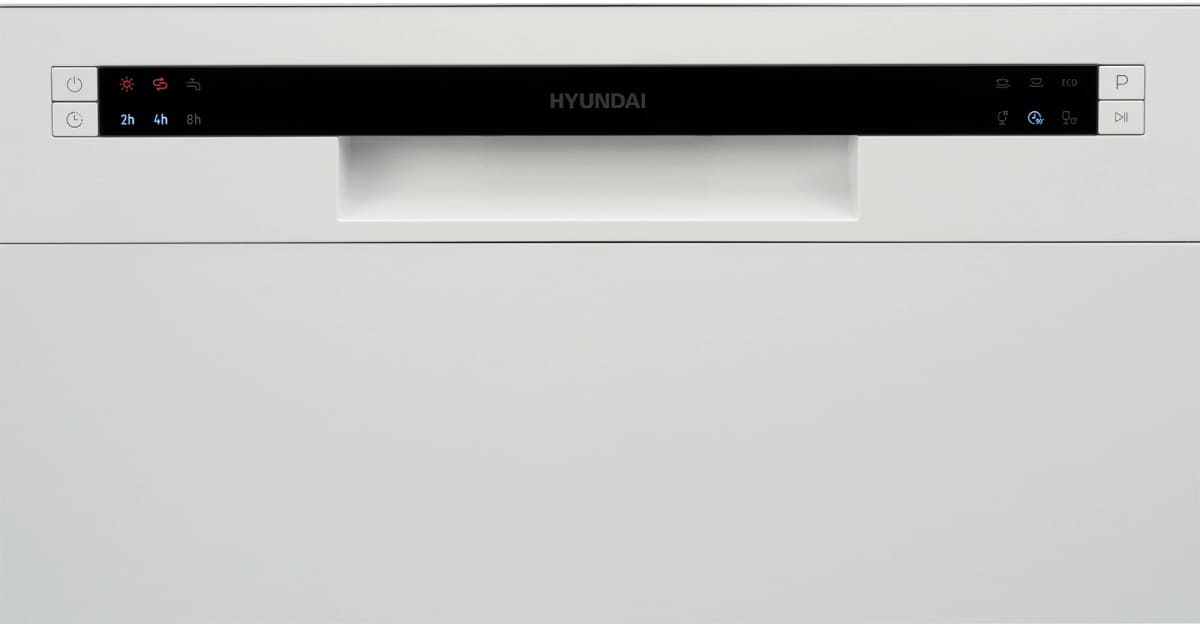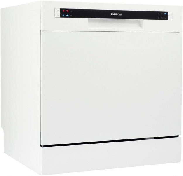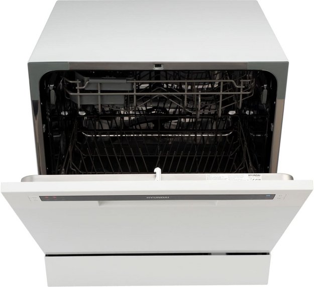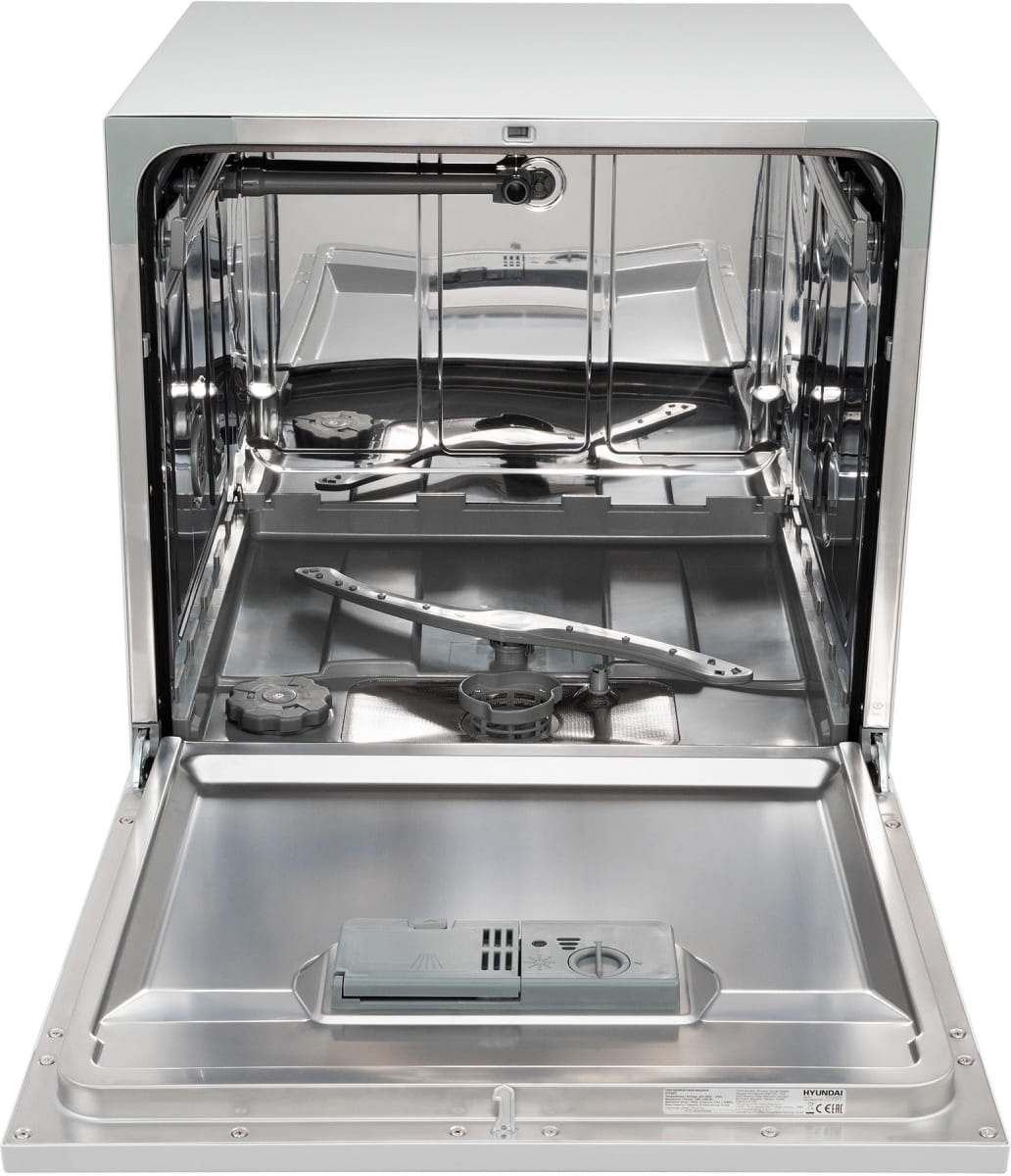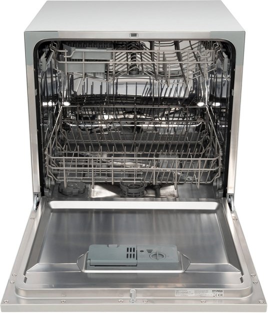 Отдельностоящая модель Хендай отлично впишется в кухонный интерьер, главное — правильно выбрать место, чтобы подвести коммуникации. Компактные размеры позволяют разместить ее даже на очень маленькой кухне. В камеру можно загрузить ограниченное число комплектов: 8 шт. Комплектом считается набор посуды на одного человека, который нужен для полноценного приема пищи: глубокая и плоская тарелки, тарелка для салата, блюдце под чашку, сама чашка, ложка и вилка.