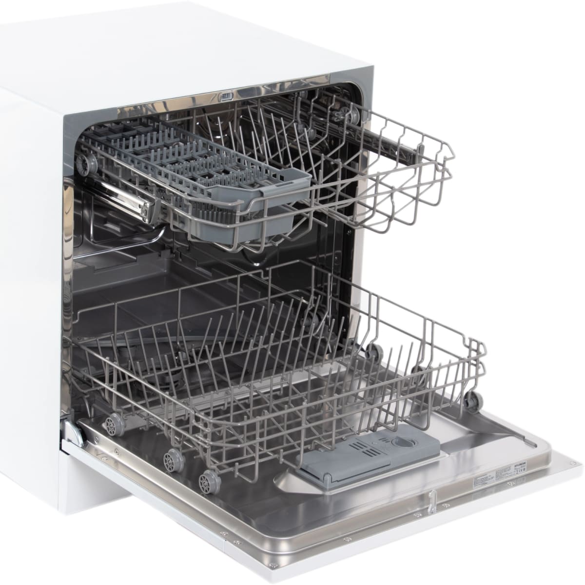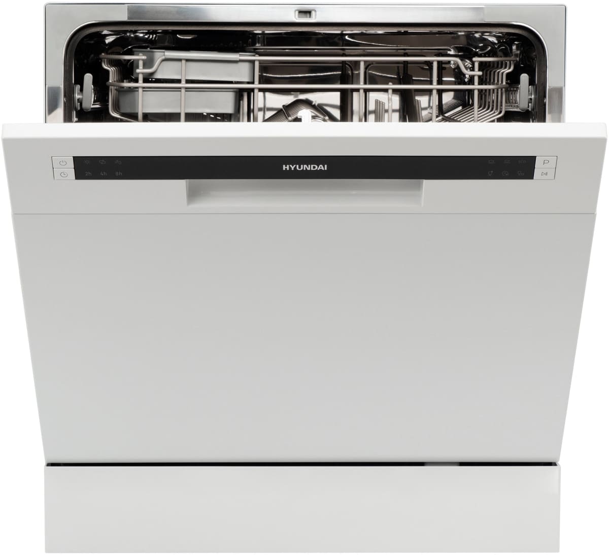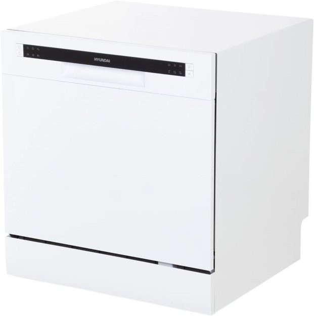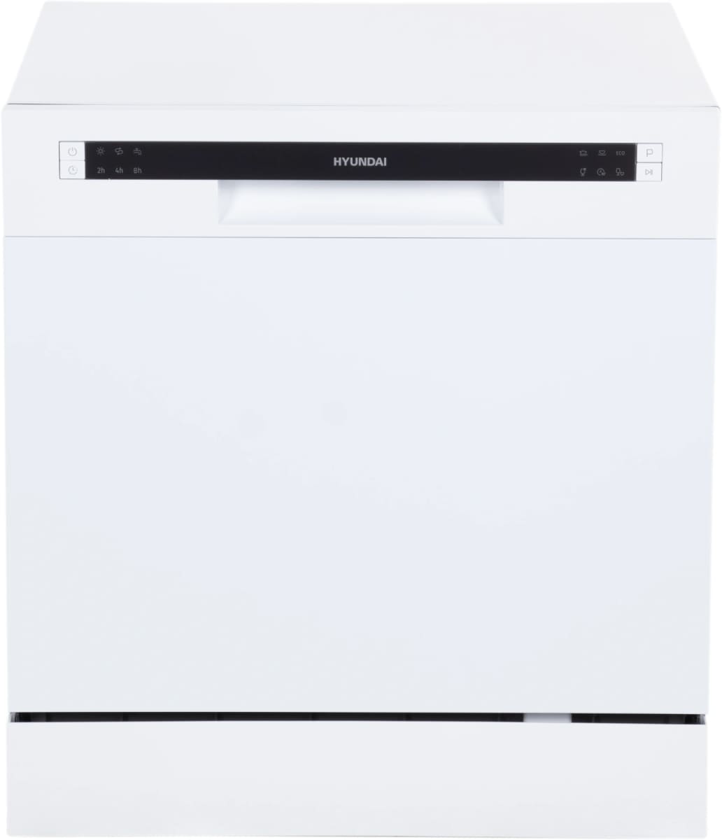 Отдельностоящая модель Хендай отлично впишется в кухонный интерьер, главное — правильно выбрать место, чтобы подвести коммуникации. Компактные размеры позволяют разместить ее даже на очень маленькой кухне. В камеру можно загрузить ограниченное число комплектов: 8 шт. Комплектом считается набор посуды на одного человека, который нужен для полноценного приема пищи: глубокая и плоская тарелки, тарелка для салата, блюдце под чашку, сама чашка, ложка и вилка.