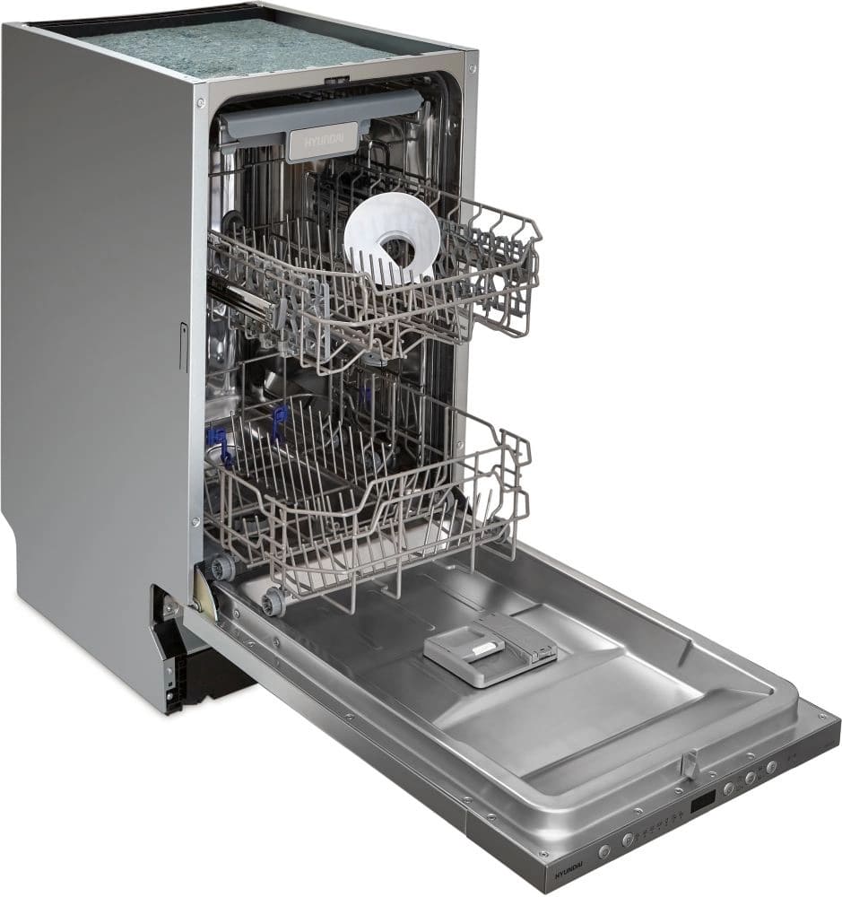 Встраиваемая модель Хендай отлично впишется в любой интерьер, главное — правильно выбрать место, чтобы подвести коммуникации. Устанавливается в нишу целиком, полностью закрывается декоративной панелью. Обратите внимание: в комплекте не идет фасад, его необходимо установить самостоятельно. Имеет уменьшенную ширину — благодаря этому поместится даже на очень маленькой кухне. В камеру можно загрузить ограниченное число комплектов: 10 шт. Комплектом считается набор посуды на одного человека, который нужен для полноценного приема пищи: глубокая и плоская тарелки, тарелка для салата, блюдце под чашку, сама чашка, ложка и вилка.