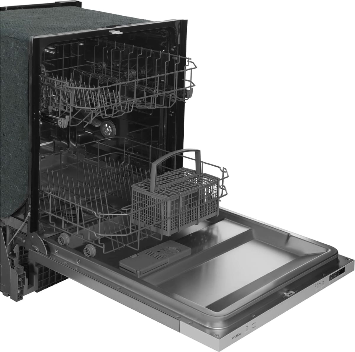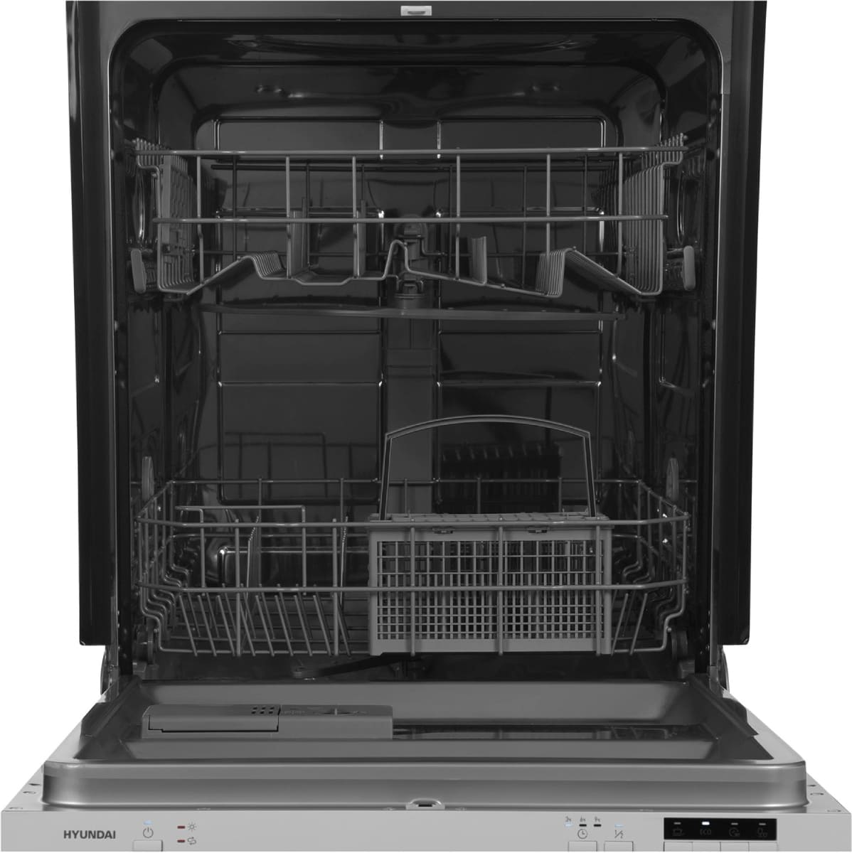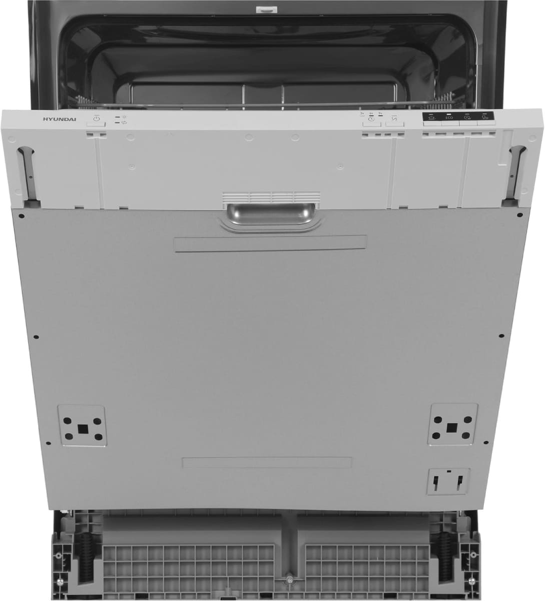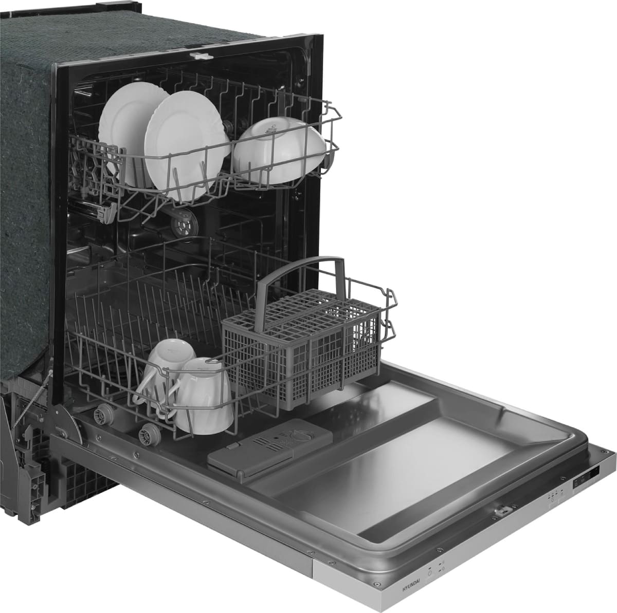 Встраиваемая модель Хендай отлично впишется в любой интерьер, главное — правильно выбрать место, чтобы подвести коммуникации. Устанавливается в нишу целиком, полностью закрывается декоративной панелью. Обратите внимание: в комплекте не идет фасад, его необходимо установить самостоятельно. Имеет стандартные размеры, поэтому может не поместиться на очень маленькой кухне. В камеру можно загрузить ограниченное число комплектов: 12 шт. Комплектом считается набор посуды на одного человека, который нужен для полноценного приема пищи: глубокая и плоская тарелки, тарелка для салата, блюдце под чашку, сама чашка, ложка и вилка.
