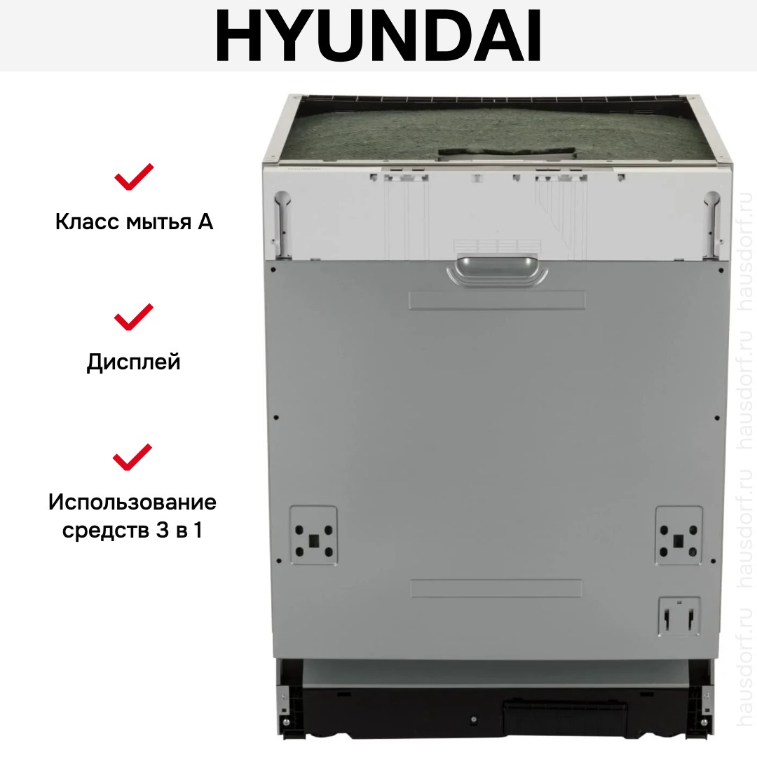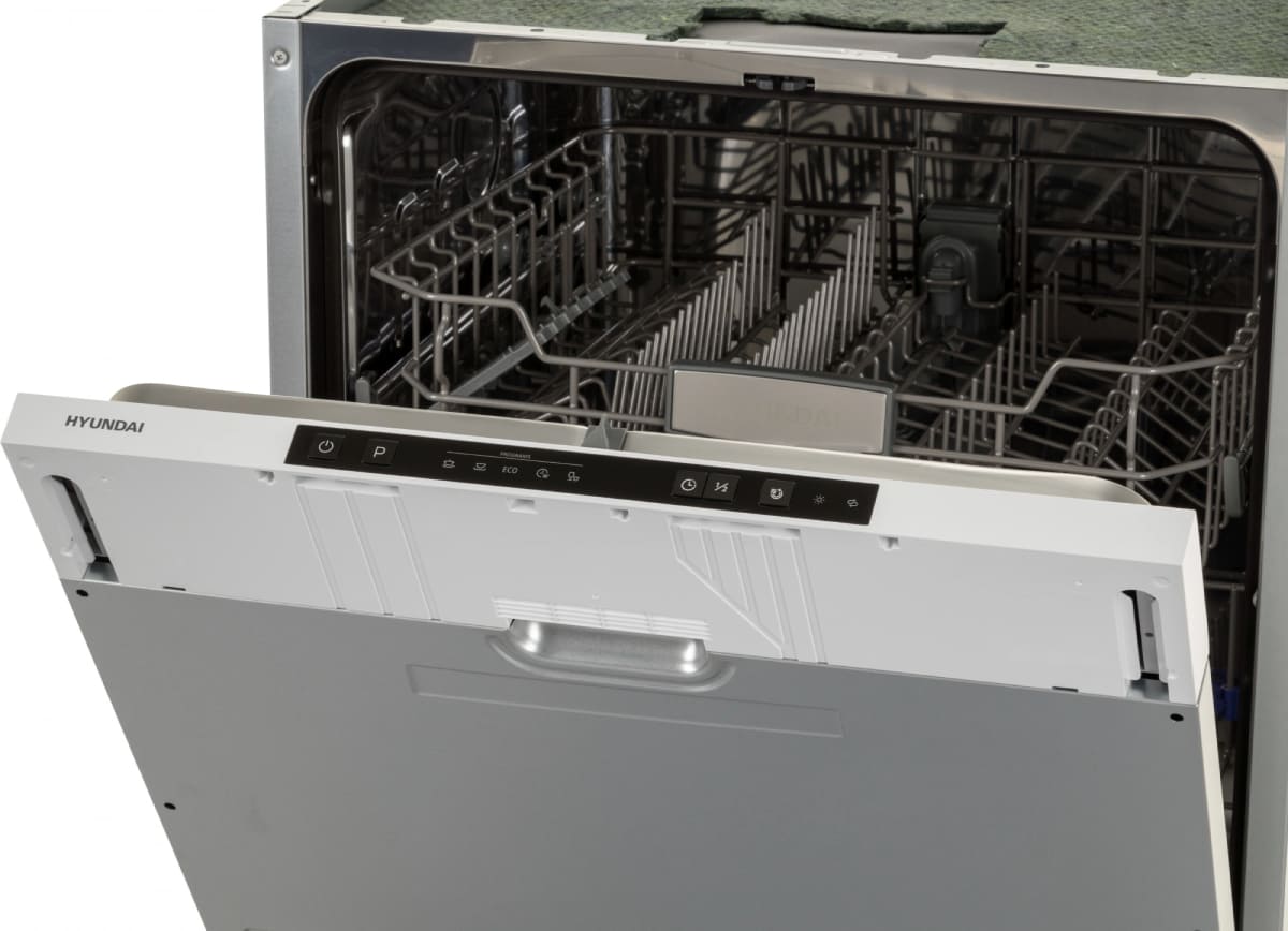 Встраиваемая модель Хендай отлично впишется в любой интерьер, главное — правильно выбрать место, чтобы подвести коммуникации. Устанавливается в нишу целиком, полностью закрывается декоративной панелью. Обратите внимание: в комплекте не идет фасад, его необходимо установить самостоятельно. Имеет стандартные размеры, поэтому может не поместиться на очень маленькой кухне. В камеру можно загрузить ограниченное число комплектов: 12 шт. Комплектом считается набор посуды на одного человека, который нужен для полноценного приема пищи: глубокая и плоская тарелки, тарелка для салата, блюдце под чашку, сама чашка, ложка и вилка.