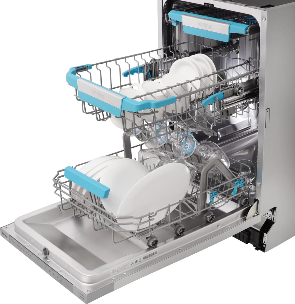 Встраиваемая модель Кертинг отлично впишется в любой интерьер, главное — правильно выбрать место, чтобы подвести коммуникации. Устанавливается в нишу целиком, полностью закрывается декоративной панелью. Обратите внимание: в комплекте не идет фасад, его необходимо установить самостоятельно. Имеет уменьшенную ширину — благодаря этому поместится даже на очень маленькой кухне. В камеру можно загрузить ограниченное число комплектов: 10 шт. Комплектом считается набор посуды на одного человека, который нужен для полноценного приема пищи: глубокая и плоская тарелки, тарелка для салата, блюдце под чашку, сама чашка, ложка и вилка.