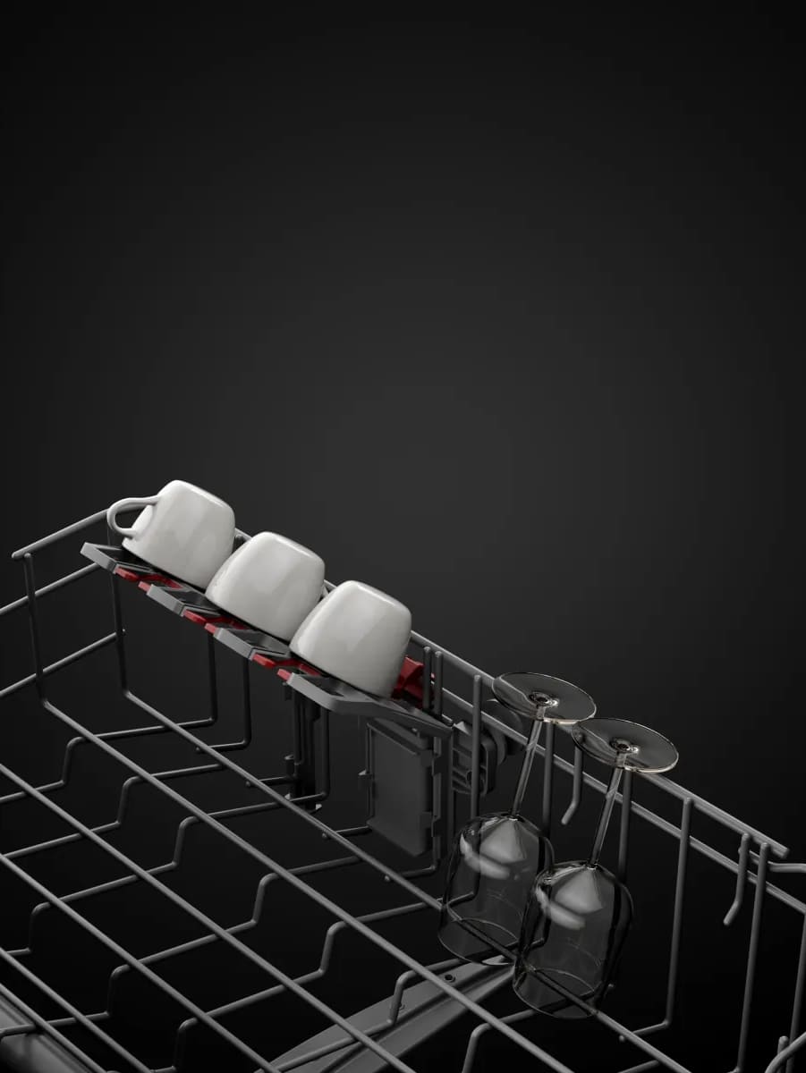 Для размещения чашек, стаканов и бокалов в посудомоечной машине предназначаются различные полки, решетки и подставки. Подобные предметы обычно не нуждаются в особо интенсивном мытье и размещаются в верхней корзине, при этом устанавливать их нужно отверстием вниз. Для небольших кофейных и чайных чашечек предназначаются откидные полки из прочного термостойкого пластика, которые крепятся к боковым сторонам корзины. Как и другие съемные элементы, эти полки выделяются цветом.