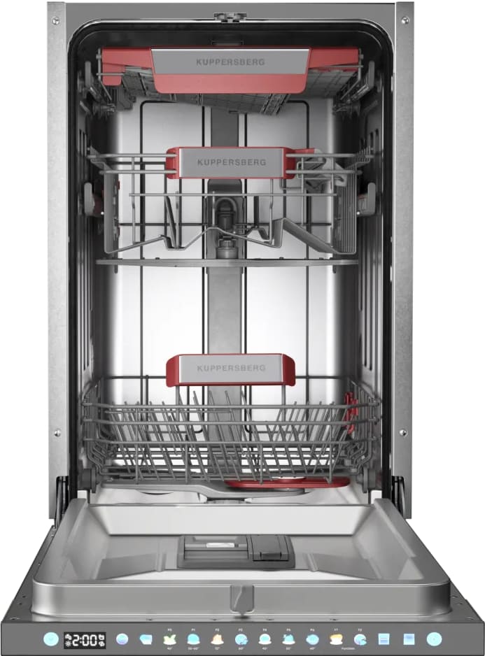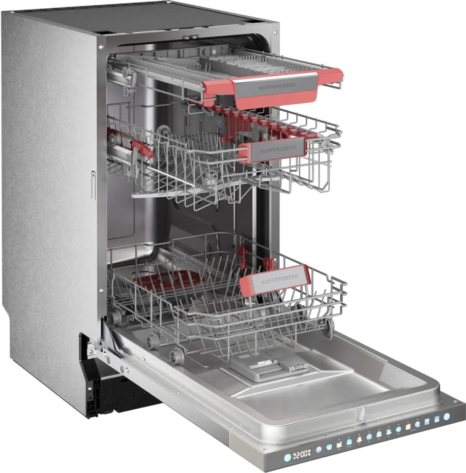 Встраиваемая модель Куперсберг отлично впишется в любой интерьер, главное — правильно выбрать место, чтобы подвести коммуникации. Устанавливается в нишу целиком, полностью закрывается декоративной панелью. Обратите внимание: в комплекте не идет фасад, его необходимо установить самостоятельно. Имеет уменьшенную ширину — благодаря этому поместится даже на очень маленькой кухне. В камеру можно загрузить ограниченное число комплектов: 10 шт. Комплектом считается набор посуды на одного человека, который нужен для полноценного приема пищи: глубокая и плоская тарелки, тарелка для салата, блюдце под чашку, сама чашка, ложка и вилка.