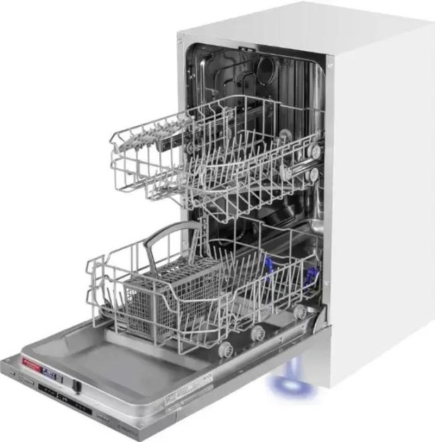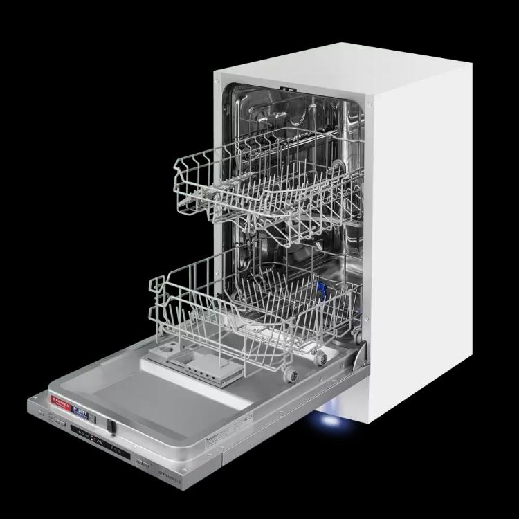Встраиваемая модель Маунфилд отлично впишется в любой интерьер, главное — правильно выбрать место, чтобы подвести коммуникации. Устанавливается в нишу целиком, полностью закрывается декоративной панелью. Имеет уменьшенную ширину — благодаря этому поместится даже на очень маленькой кухне. В камеру можно загрузить ограниченное число комплектов: 9 шт. Комплектом считается набор посуды на одного человека, который нужен для полноценного приема пищи: глубокая и плоская тарелки, тарелка для салата, блюдце под чашку, сама чашка, ложка и вилка.