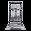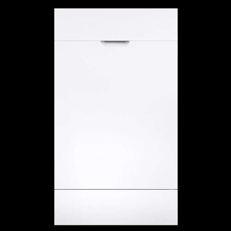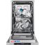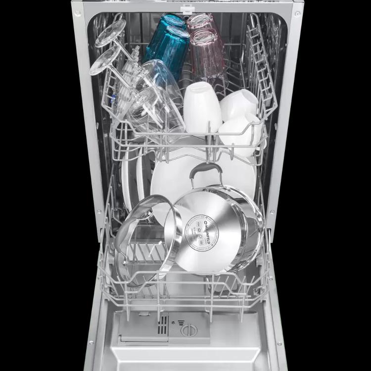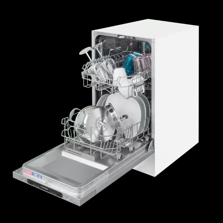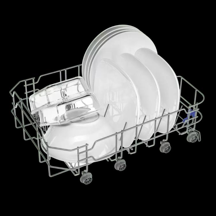 Внутренняя схема оптимизирована под 9 комплектов посуды, что идеально для небольших семей или тех, кто редко готовит на большую компанию. Есть корзина для столовых приборов, а регулируемые ножки упрощают выравнивание в нише. Глубина 55 см и узкая конструкция обеспечивают удобное размещение в кухонном модуле без потери функциональности, а вес и габариты позволяют рассчитать нагрузку на кухонную мебель.