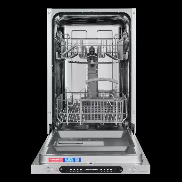 Посудомоечная машина Maunfeld MLP4249G02 Light Beam — встроенная, полностью интегрируемая узкая модель, созданная для аккуратной встройки в кухонный гарнитур. Ее компактные габариты 81.5×44.8×55 см и требуемая ниша 82×45×55 см позволяют установить прибор даже в тесной кухне. Фронтальную панель можно закрыть фасадом вашего шкафа, а декоративная панель управления выполнена из нержавеющей стали с черными элементами, что добавляет солидности и долговечности внешней части.