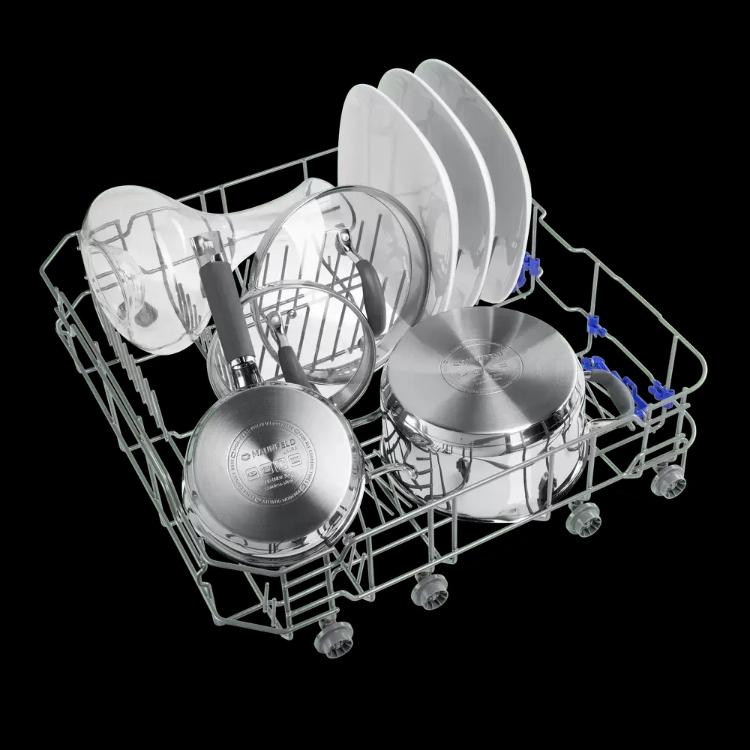 Посудомоечная машина Maunfeld MLP6242G02 Light Beam — встроенная полноразмерная модель в нержавеющей стали. Она рассчитана на полное скрытое встраивание и аккуратно вписывается в мебельный гарнитур. Черная панель управления создает контраст и подчеркивает современный облик при минимальном внешнем визуальном следе. Компактные габариты 81.5×59.5×55 см и продуманная глубина обеспечивают удобство монтажа в стандартную кухонную нишу 82×60×55.5 см. Регулируемые ножки позволяют точно выставить прибор по уровню пола, что упрощает установку и продлевает срок службы.