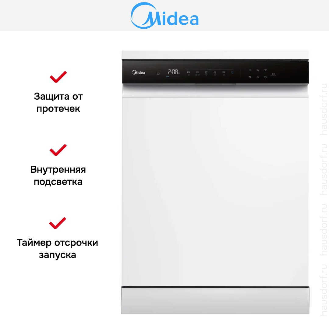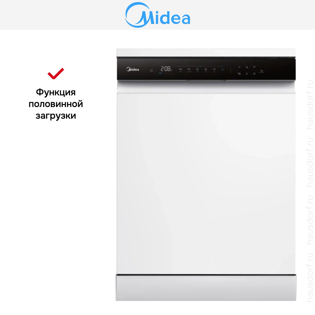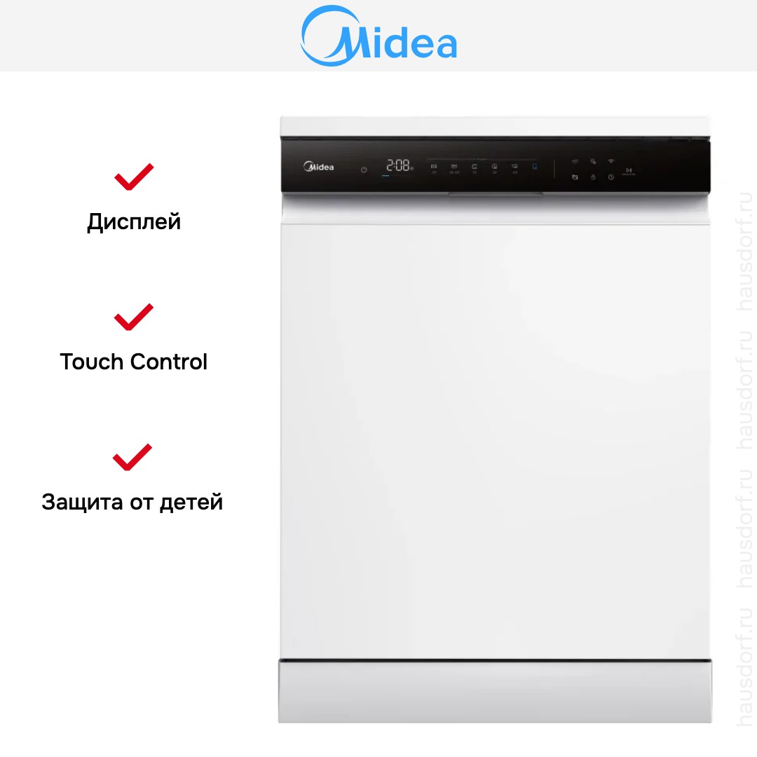 Посудомоечная машина Midea MFD60S510WI сочетает в себе сдержанный городской дизайн и практичность для повседневного использования. Корпус белого цвета с контрастной черной панелью управления выглядит аккуратно и нейтрально, поэтому прибор легко впишется в разные кухонные интерьеры. Габариты 84.5×59.8×60 см соответствуют полноразмерному стандарту, поэтому модель удобно устанавливается отдельно, оставляя место для комфортной загрузки посуды. Черная сенсорная панель придает внешности современный акцент и обеспечивает простое взаимодействие с устройством.