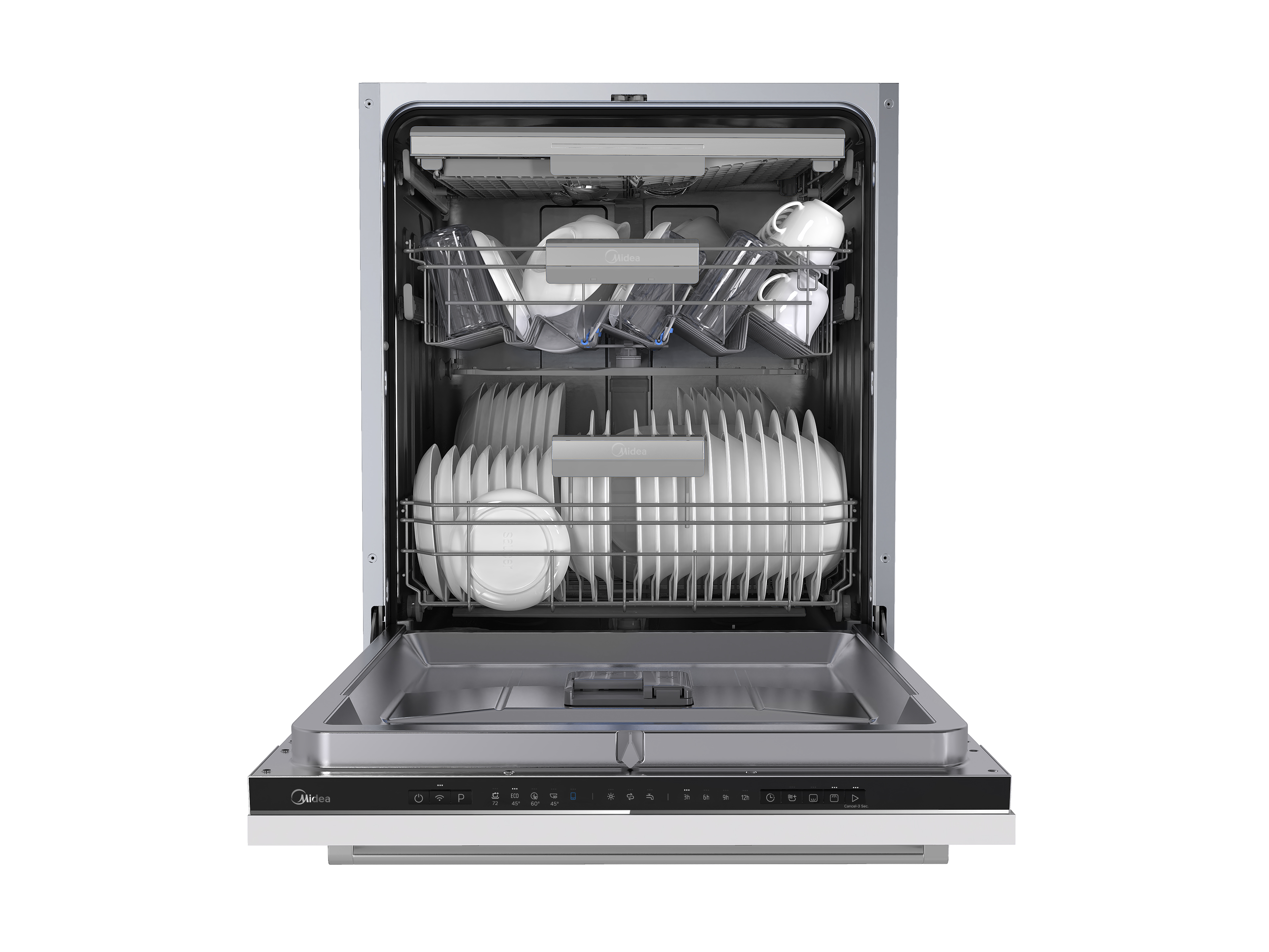Встраиваемая модель Мидеа отлично впишется в любой интерьер, главное — правильно выбрать место, чтобы подвести коммуникации. Устанавливается в нишу целиком, полностью закрывается декоративной панелью. Обратите внимание: в комплекте не идет фасад, его необходимо установить самостоятельно. Имеет стандартные размеры, поэтому может не поместиться на очень маленькой кухне. В камеру можно загрузить ограниченное число комплектов: 14 шт. Комплектом считается набор посуды на одного человека, который нужен для полноценного приема пищи: глубокая и плоская тарелки, тарелка для салата, блюдце под чашку, сама чашка, ложка и вилка.