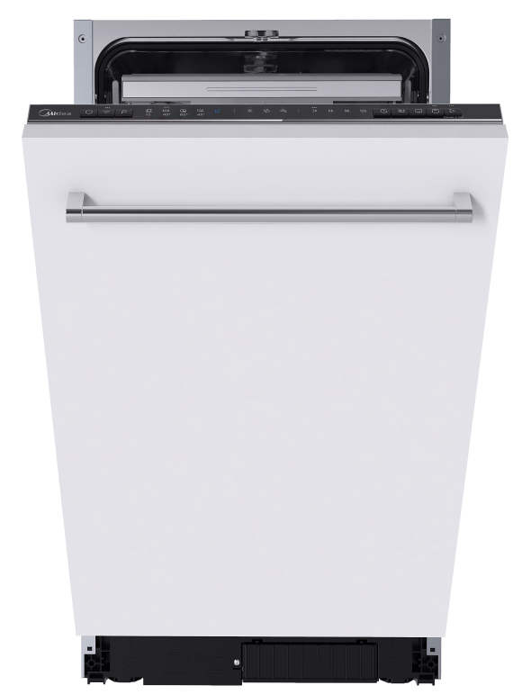 Встраиваемая модель Мидеа отлично впишется в любой интерьер, главное — правильно выбрать место, чтобы подвести коммуникации. Устанавливается в нишу целиком, полностью закрывается декоративной панелью. Обратите внимание: в комплекте не идет фасад, его необходимо установить самостоятельно. Имеет уменьшенную ширину — благодаря этому поместится даже на очень маленькой кухне. В камеру можно загрузить ограниченное число комплектов: 10 шт. Комплектом считается набор посуды на одного человека, который нужен для полноценного приема пищи: глубокая и плоская тарелки, тарелка для салата, блюдце под чашку, сама чашка, ложка и вилка.