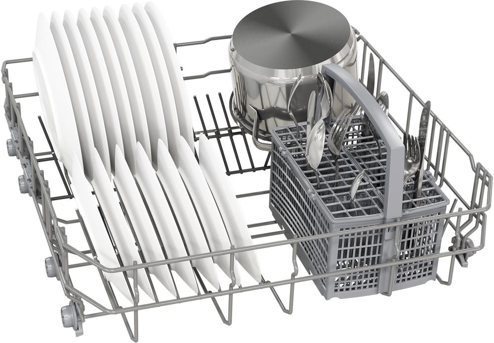 Корзина для столовых приборов достаточно высока, ввиду чего она устанавливается в нижнем коробе, где для нее предусматривается специальное место между разделителями для тарелок. Приборы в корзине могут размещаться как вниз, так и вверх рукоятками — это зависит от количества приборов и требований пользователя. Однако острые предметы — ножи или вилки — необходимо размещать острием вниз для предотвращения травм. Ножи рекомендуется размещать в корзинах с осторожностью, поскольку лезвия из керамики, например, могут затупиться. Чтобы избежать этого, следует использовать фирменные моющие средства и обязательно располагать ножи по отдельности, чтобы они не соприкасались с другими предметами.