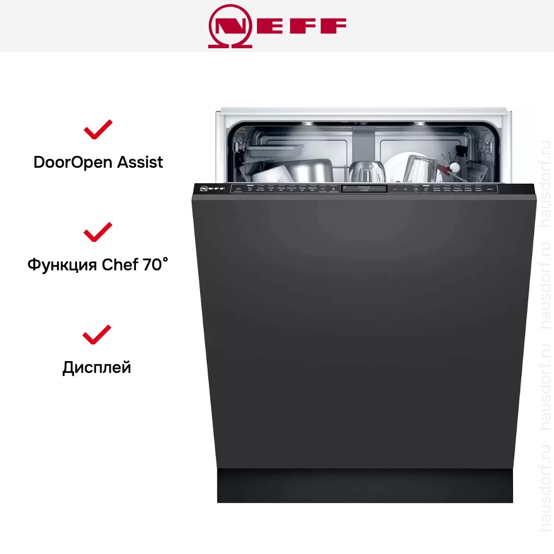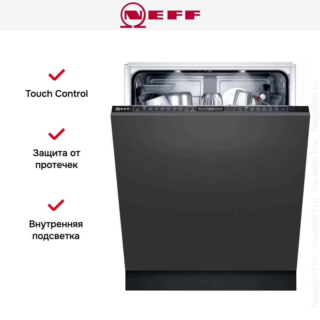 Посудомоечные машины производства известного немецкого бренда Neff разработаны для полной интеграции в интерьер современной кухни. Эти встраиваемые устройства выпускаются в двух вариантах: узкие — шириной 45 см и вместимостью 8-10 комплектов посуды — и полноразмерные — шириной 60 см и вместимостью до 14 комплектов посуды. Все модели предназначены для установки на них декоративного мебельного фасада, полностью соответствующего выбранному стилю.