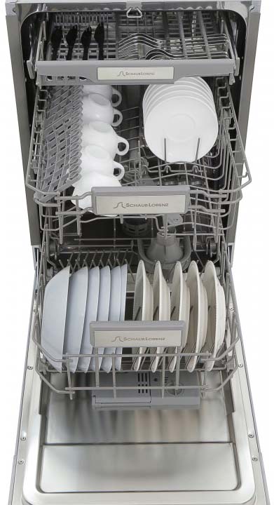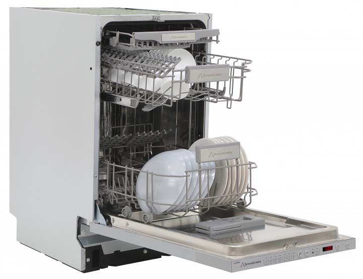 Встраиваемая модель Шауб Лоренц отлично впишется в любой интерьер, главное — правильно выбрать место, чтобы подвести коммуникации. Устанавливается в нишу целиком, полностью закрывается декоративной панелью. Обратите внимание: в комплекте не идет фасад, его необходимо установить самостоятельно. Имеет уменьшенную ширину — благодаря этому поместится даже на очень маленькой кухне. В камеру можно загрузить ограниченное число комплектов: 11 шт. Комплектом считается набор посуды на одного человека, который нужен для полноценного приема пищи: глубокая и плоская тарелки, тарелка для салата, блюдце под чашку, сама чашка, ложка и вилка.