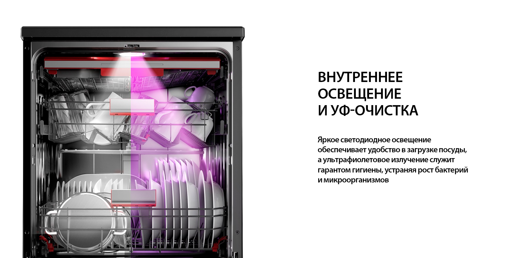 Внутренняя подсветка камеры посудомоечной машины значительно облегчает загрузку и разгрузку посуды, добавление моющего средства, соли и ополаскивателя, гарантирует поддержание чистоты и своевременное удаление остатков пищи, не позволяет забыть мелкие столовые приборы, особенно случайно упавшие на дно камеры, а также упрощает извлечение и очистку фильтра. Подсветка, как правило, включается автоматически, как только открывается дверца посудомоечной машины.