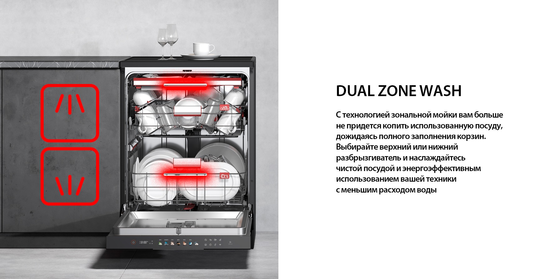 - Dual Zone Wash. Функция позволяет выбирать зону интенсивной мойки (верхняя или нижняя корзина). Это рациональный подход к ресурсам: вы можете запустить цикл даже при частичной загрузке, экономя воду и электроэнергию без необходимости ждать заполнения всей камеры.