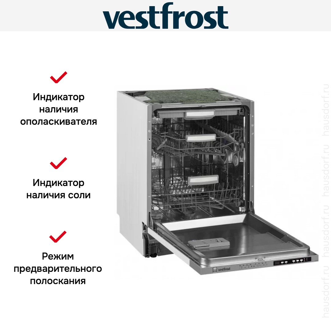 Vestfrost VFDW 6041 — полноразмерная модель встраиваемого типа установки. Рабочая камера устройства одновременно вмещает до 15 стандартных комплектов посуды. Для размещения столовых приборов, в том числе длинных ножей или половников, предусмотрена специальная третья корзина. Безопасная эксплуатация прибора обеспечивается системой Aquastop, надежно защищающей от утечек.