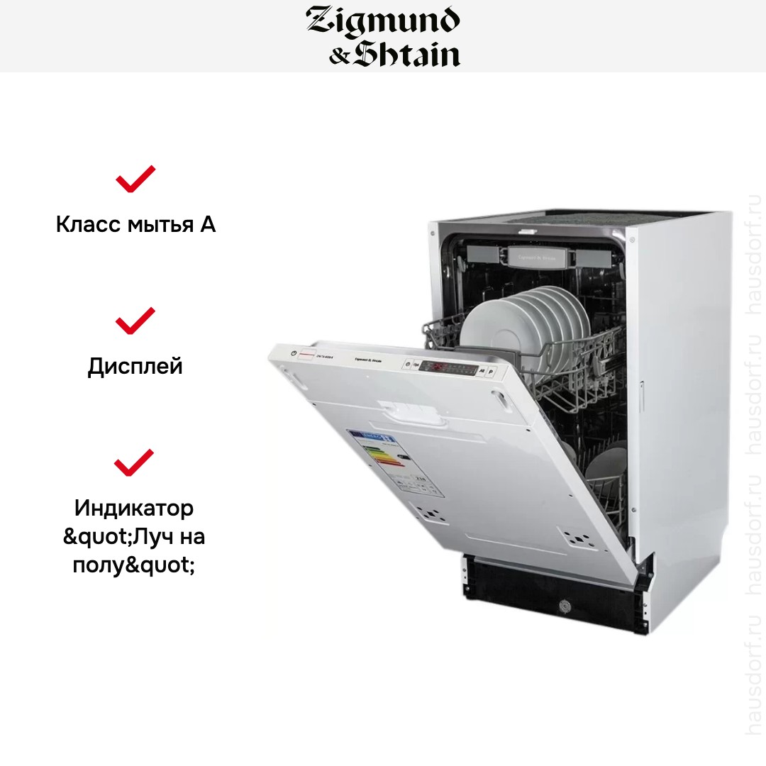 Zigmund Shtain DW 129.4509 X — полновстраиваемая посудомоечная машина с девятью рабочими режимами. Во время выполнения программы на полу отображается луч синего цвета, служащий индикатором работы модели. Для удобства загрузки предусмотрена подсветка внутренней камеры. В устройстве реализована система регулировки потребления соли и ополаскивателя в зависимости от жесткости воды, что позволяет оптимизировать уровень их расхода.