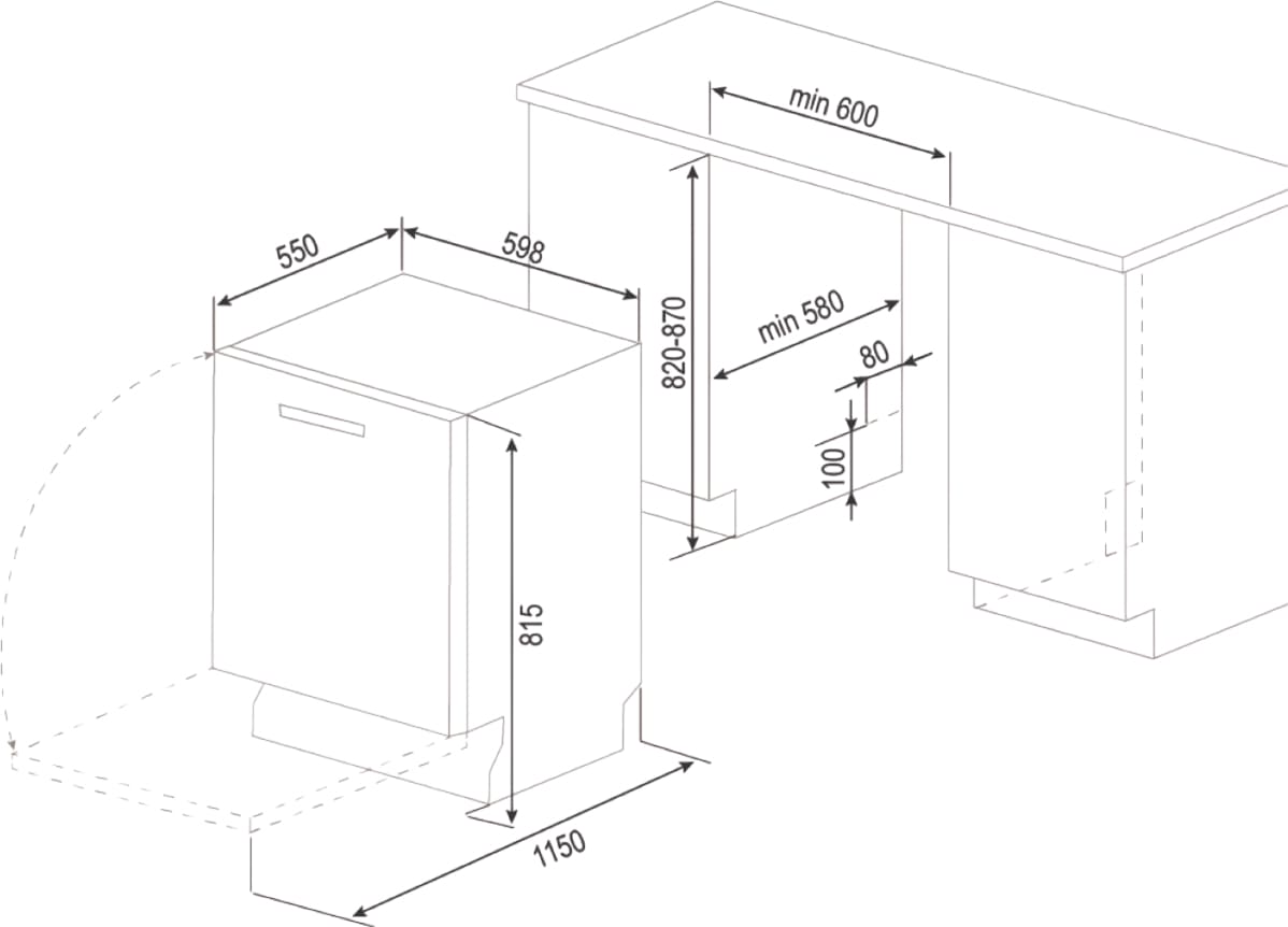 Большая часть полноразмерных и узких посудомоек встраиваемого и отдельностоящего вида имеет высоту около 82-85 см: такие модели легко размещаются под столешницей. Встраиваемые модели несколько ниже, так как у них отсутствует верхняя крышка.