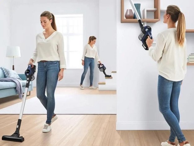 Прибор питается от сети и аккумулятора, поэтому ваши возможности максимально широки — пылесосить легко как в отдаленных от розетки углах, так и в сложных местах, где понадобится максимальная мощность и непрерывный заряд. Предусмотрена удобная система парковки — вертикальная, с которой пылесос занимает меньше места.