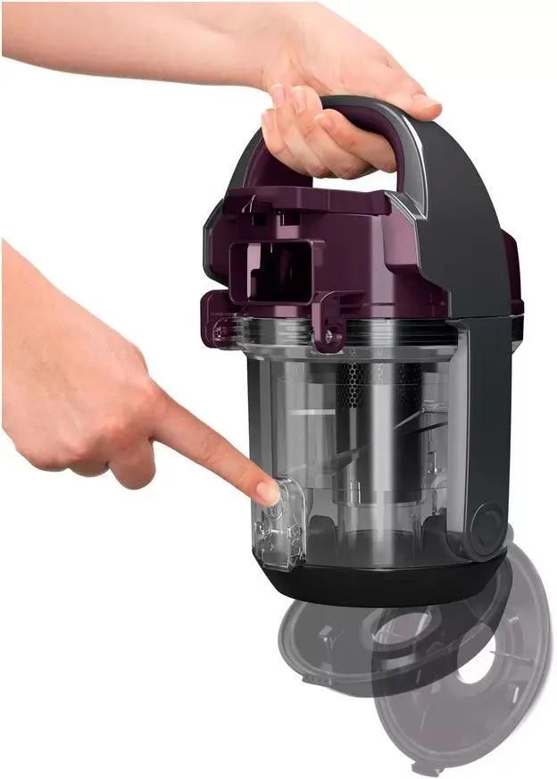 Пылесосы с контейнером-пылесборником позволяют уловить до 99% всех загрязнений, при этом интенсивность всасывания будет одинаковой независимо от заполнения контейнера. Пластиковый контейнер не требует замены, легко снимается для очистки, его можно мыть под струей воды после каждой уборки.
