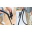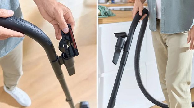 Шнур питания автоматически сматывается по завершении уборки. Для удлинения расстояния от корпуса до насадки используется специальная трубка, в данном случае — телескопическая. Сами насадки можно хранить в предусмотренном для этого отсеке.