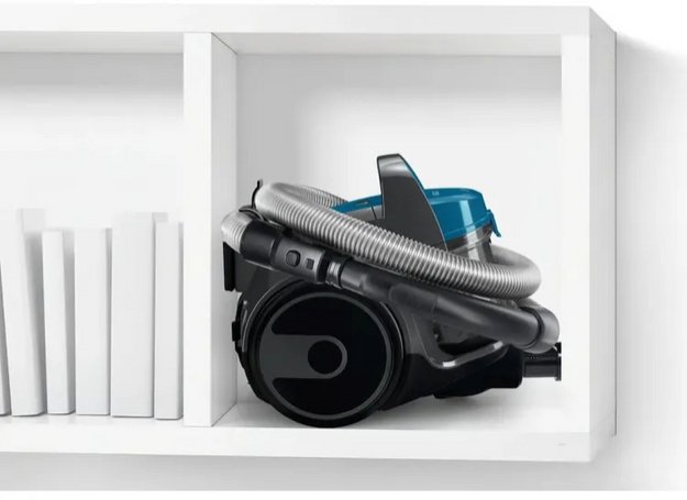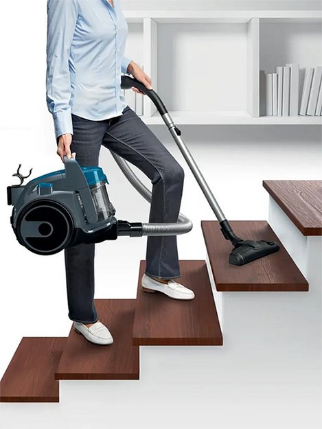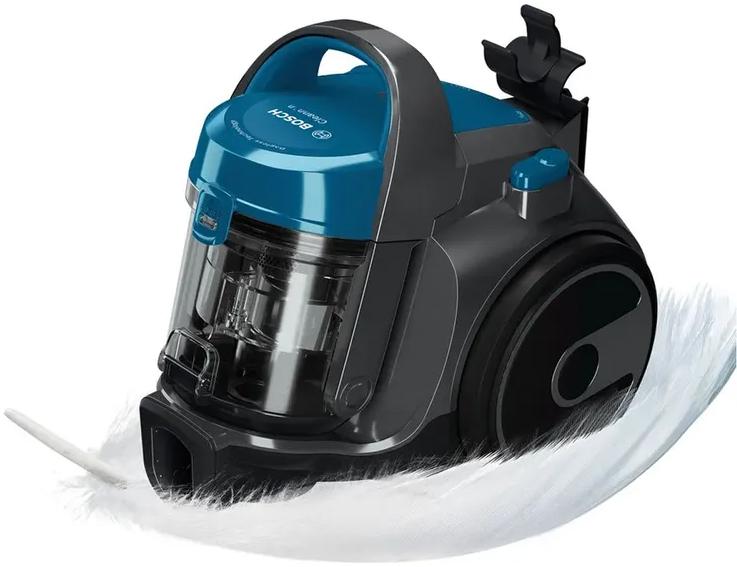 Пылесос Bosch BGS05A220 имеет стандартную конфигурацию — корпус на колесах, крепящийся к нему шланг с трубками-удлинителями и насадками. Данная модель рассчитана только на сухую уборку, которой достаточно для большинства пользователей. Мощный поток воздуха позволяет быстро всасывать как мелкие, так и крупные частицы, волосы и шерсть. Основной цвет прибора — синий. В качестве пылесборника производитель установил стандартный контейнер. Пользоваться им легко и удобно: чтобы очистить, просто достаньте его и высыпьте все в мусорное ведро, а затем протрите или вымойте емкость изнутри. Объем заполнения пылесборника — 1.5 л.