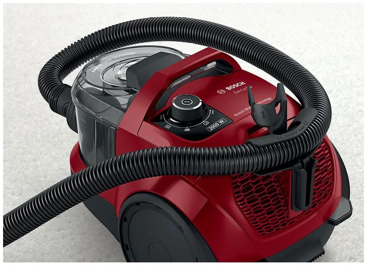 Пылесос Bosch BGS21WX200 имеет стандартную конфигурацию — корпус на колесах, крепящийся к нему шланг с трубками-удлинителями и насадками. Данная модель рассчитана только на сухую уборку, которой достаточно для большинства пользователей. Мощный поток воздуха позволяет быстро всасывать как мелкие, так и крупные частицы, волосы и шерсть. Основной цвет прибора — красный. В качестве пылесборника производитель установил стандартный контейнер. Пользоваться им легко и удобно: чтобы очистить, просто достаньте его и высыпьте все в мусорное ведро, а затем протрите или вымойте емкость изнутри. Объем заполнения пылесборника — 2 л.