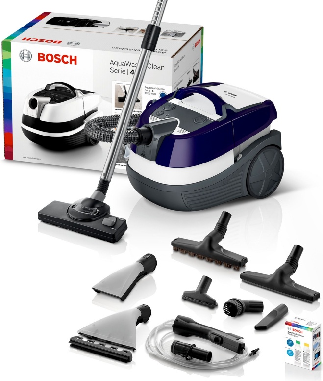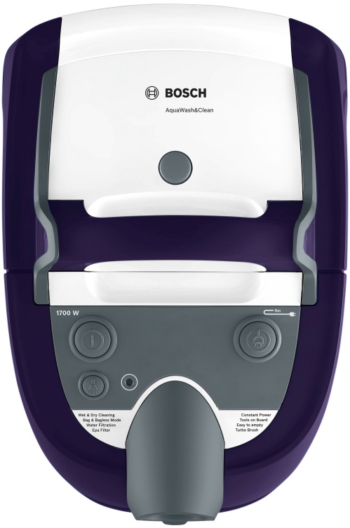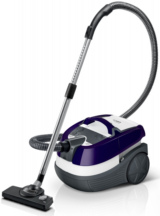 Пылесос Bosch BWD41740 имеет стандартную конфигурацию — корпус на колесах, крепящийся к нему шланг с трубками-удлинителями и насадками. Данная модель рассчитана на сухую и влажную уборку — удобный многофункциональный вариант для семей с детьми, владельцев животных, любителей растений и просто для тех, кто хочет без особых усилий поддерживать дома идеальную чистоту. Основной цвет прибора — фиолетовый. Пылесборник-мешок — привычный вариант, с которым легко работать, можно не беспокоиться о чрезмерном расходе электроэнергии. Он тщательно запирает внутри крупную пыль, но может незначительно пропускает очень мелкие частицы. Объем заполнения пылесборника — 1.5 л.