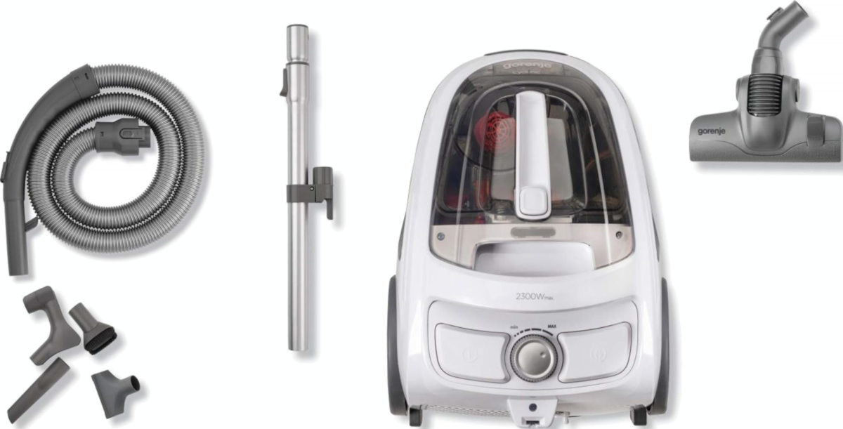 Пылесос Gorenje VC2301SPWCY имеет стандартную конфигурацию — корпус на колесах, крепящийся к нему шланг с трубками-удлинителями и насадками. Данная модель рассчитана только на сухую уборку, которой достаточно для большинства пользователей. Мощный поток воздуха позволяет быстро всасывать как мелкие, так и крупные частицы, волосы и шерсть. Основной цвет прибора — белый. В качестве пылесборника производитель установил стандартный контейнер. Пользоваться им легко и удобно: чтобы очистить, просто достаньте его и высыпьте все в мусорное ведро, а затем протрите или вымойте емкость изнутри. Объем заполнения пылесборника — 1.7 л.