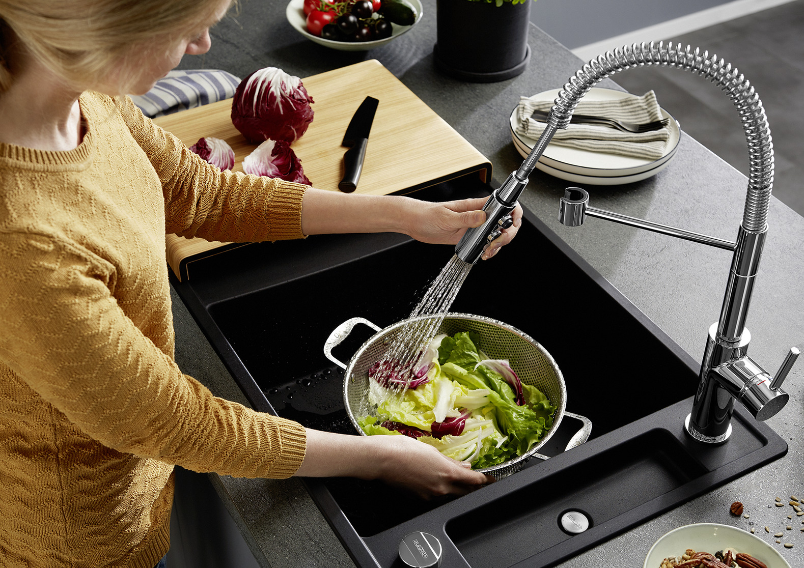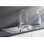 Внутри крана помещается шланг, который можно растянуть, чтобы достать струей воды до второй чаши мойки или тщательно сполоснуть посуду.
