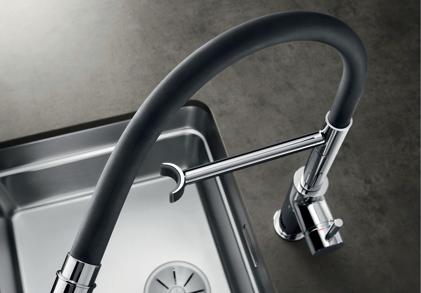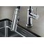 Внутри крана помещается шланг, который можно растянуть, чтобы достать струей воды до второй чаши мойки или тщательно сполоснуть посуду.