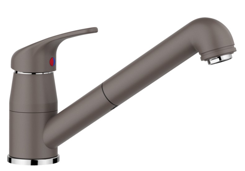 Внутри крана помещается шланг, который можно растянуть, чтобы достать струей воды до второй чаши мойки или тщательно сполоснуть посуду.