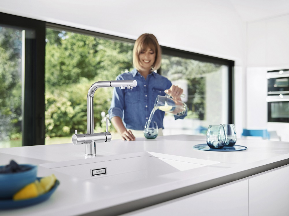 Специальная насадка позволяет выдвинуть излив как маленький шланг и направить струю в слишком высокую кастрюлю, которая не помещается под стационарным краном, на овощи в раковине, на загрязнения в неудобных уголках мойки, которые нужно удалить и т.д. Благодаря особой конструкции вы можете также направить воду из раковины в ванну или из одной чаши мойки в другую одним поворотом крана в нужную сторону. Дополнительная деталь, которая повышает комфорт использования, — аэратор. Он делает поток воды мягче, насыщая его кислородом, таким образом дополнительно уменьшая ее расход: объем струи увеличивается за счет воздуха, а не за счет повышения напора из водопровода. К этой модели можно подключить фильтр для питьевой воды.