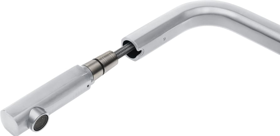 Выдвижной излив в кухонном смесителе — это гибкая трубка из резины в металлической оплетке, расположенная внутри основного излива. Для того, чтобы воспользоваться гибким изливом — например, наполнить высокую посуду, — достаточно включить воду и потянуть за головку, находящуюся на конце трубки.