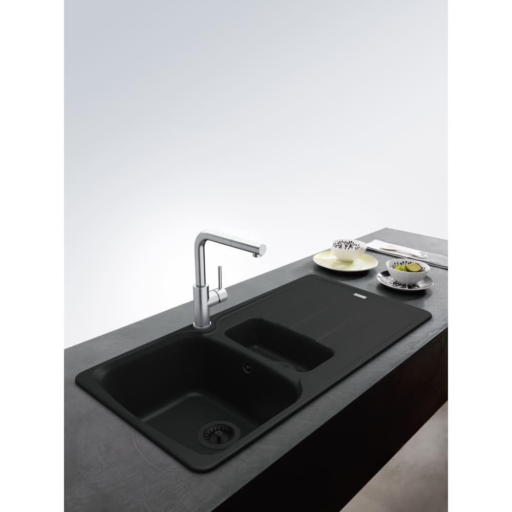 Внутри крана помещается шланг, который можно растянуть, чтобы достать струей воды до второй чаши мойки или тщательно сполоснуть посуду.